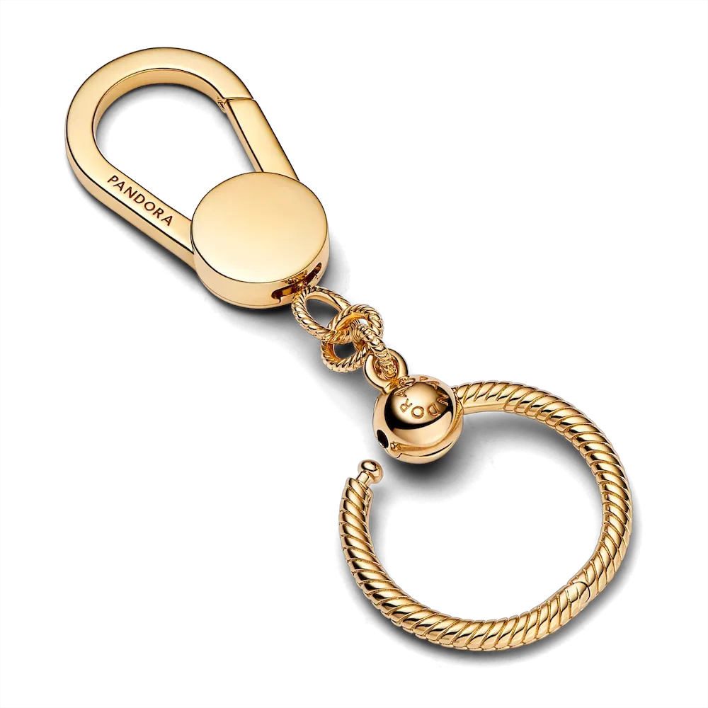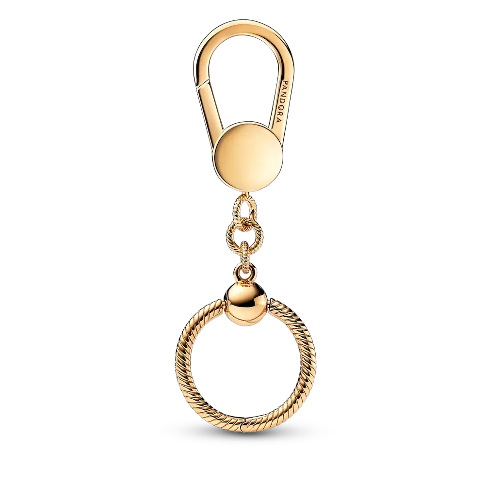 Add sparkle to your tote, cross-body or rucksack with the Pandora Moments Small Bag Charm Holder. Hand-finished with 14k gold plating, this popular charm holder features a small Pandora O Pendant. The flat disc of the lobster clasp can be engraved with your personal mantra. Style up to three of your favorite charms, dangles and pendants and make your bag a part of your story.