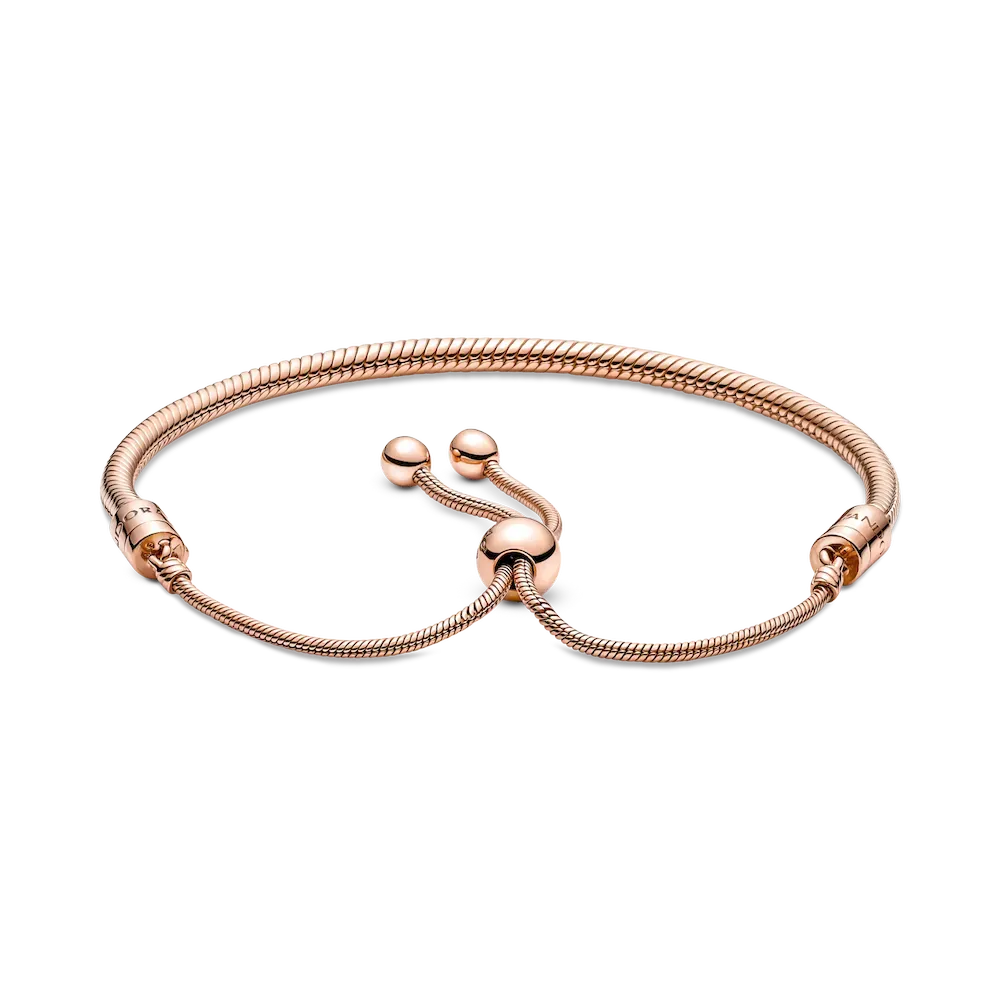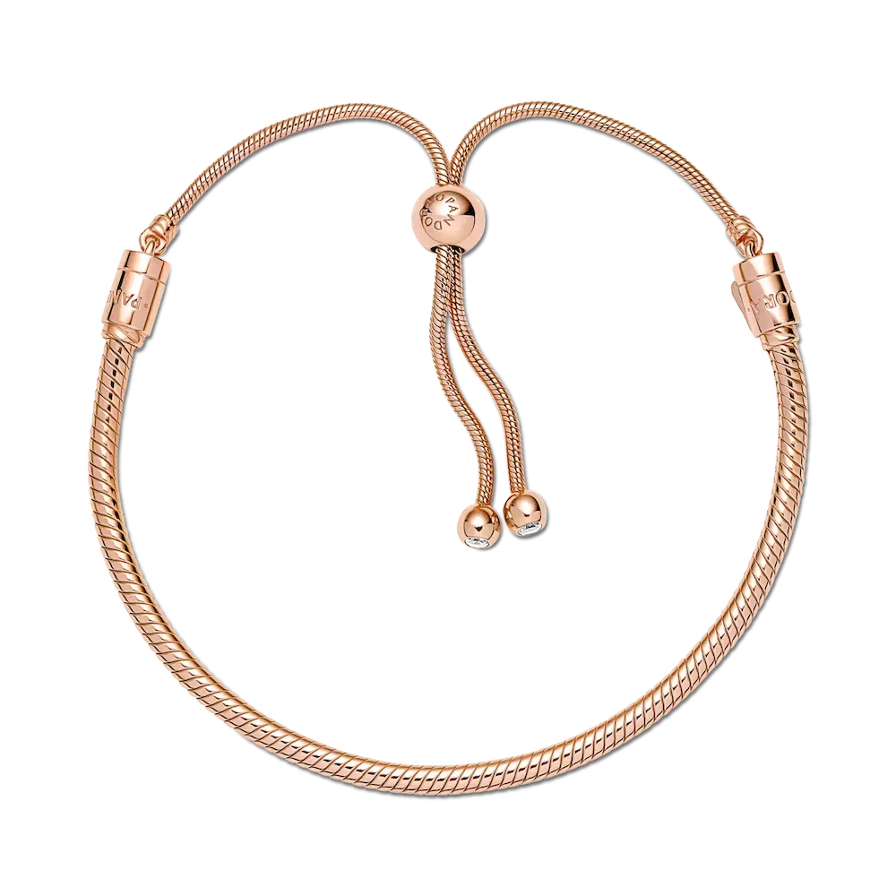 This stunning Pandora Moments Snake Chain Slider Bracelet is a sophisticated spin on the classic friendship bracelet. Hand-finished and 14k rose gold-plated, it features one fixed and one movable end cap — both set with shimmering stones. An innovative sliding clasp makes it easy to adjust it to your size. The perfect present for friends and loved ones, it can be styled by lifting the movable end cap and adding your favorite Pandora charms. The lobster clasp and jump ring are made from sterling silver plated with 14k rose gold.