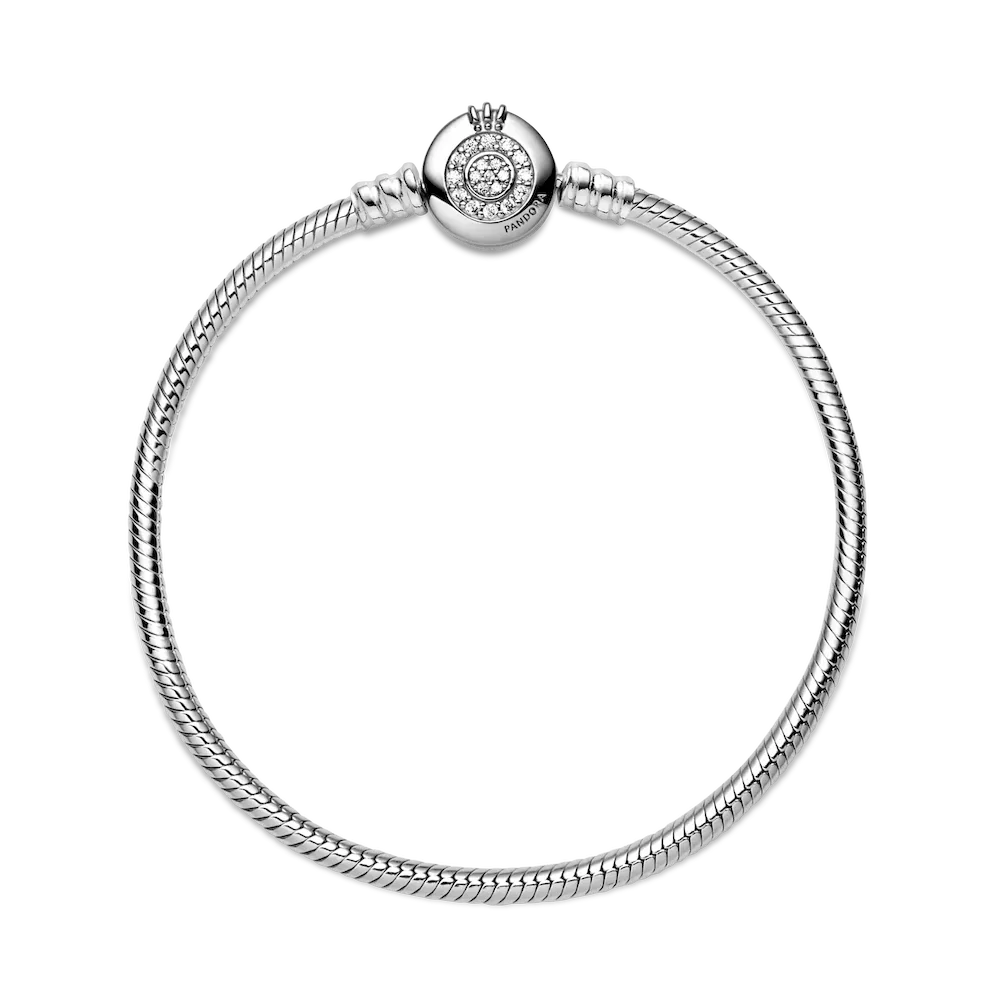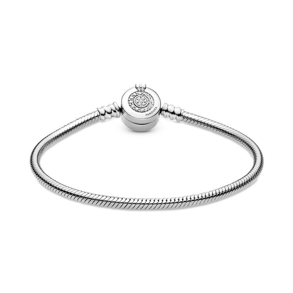 Bring some sparkle to every moment with the Pandora Moments Sparkling Crown O Snake Chain Bracelet. Hand-finished in sterling silver, the bracelet’s clasp features the iconic Pandora crown O monogram and two circles of sparkling clear cubic zirconia pavé. Another iconic Pandora design element, the snake chain, brings a chic and modern touch to your wrist. Stack it with other bracelets and load it up with favorite charms for a piece you’ll reach for over and over.