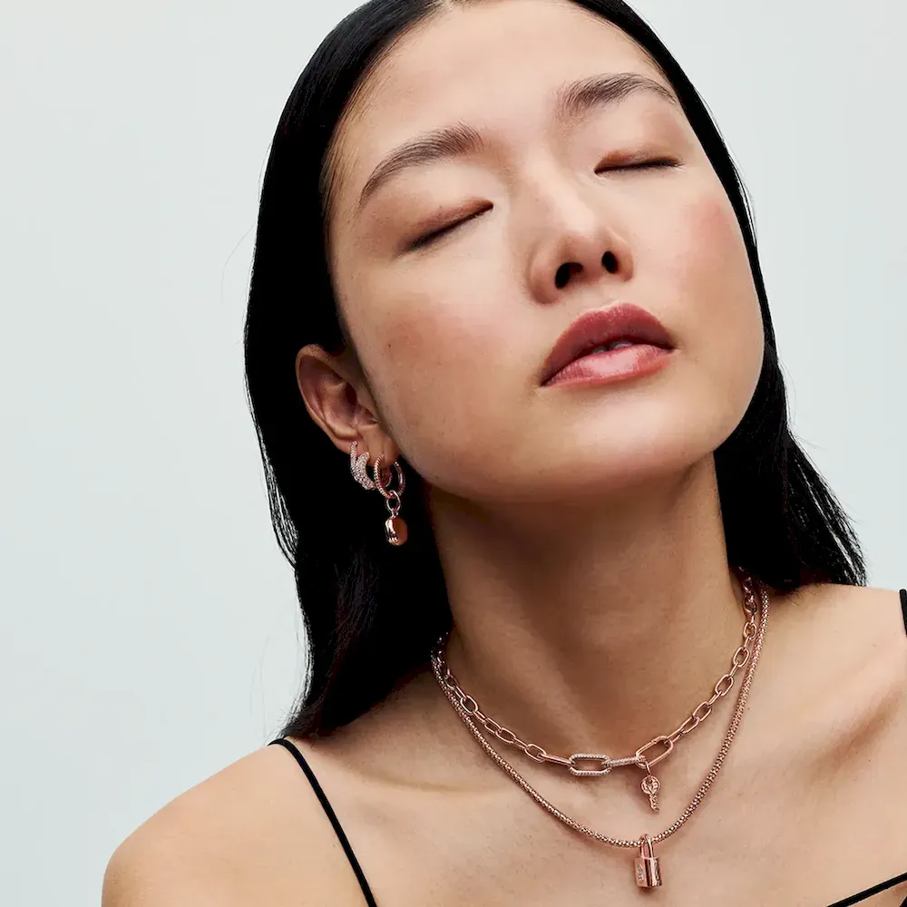 Update your jewelry collection with the Pandora Moments Studded Chain Necklace in our 14k rose gold-plated unique metal blend. This hand-finished necklace features a flexible, textured chain and an infinity-detailed heart clasp with an interior infinity symbol. This studded chain necklace can be styled with any size of the Pandora Moments O Pendant or Heart Charm Pendant. Please note the clasp cannot be styled with charms.