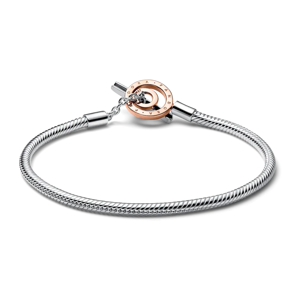Make a statement with this bold and graphic piece. Inspired by our iconic pendant design, the Pandora Moments Two-tone Logo T-Bar Snake Chain Bracelet features a duo of 14k rose-gold plated circles forming a closure that can spin a full 360 degrees. A sterling silver T-bar attaches to the inner circle to secure the clasp. Add up to 18 of your favorite charms, dangles or pendants and tell your story with your signature style.