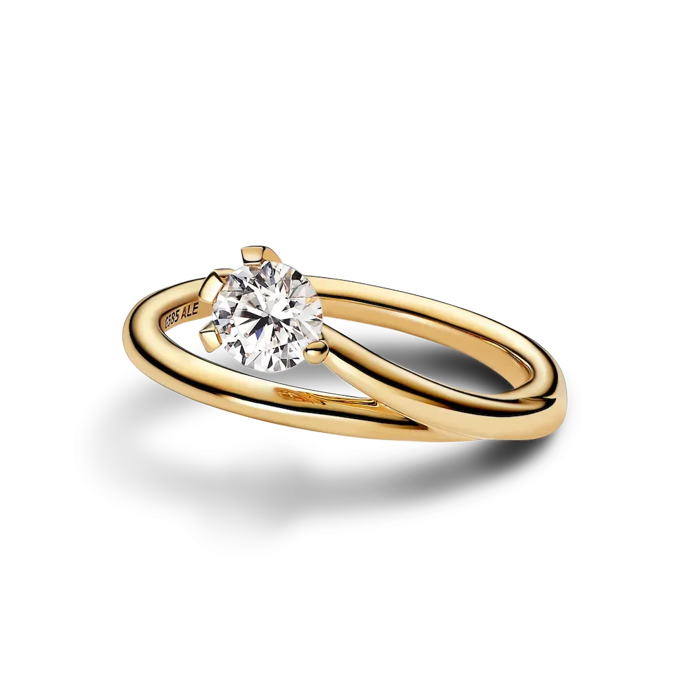 Shine in the Pandora Nova 14k Gold Lab-grown Diamond Asymmetric Ring. Inspired by the illusion of capturing and holding a precious fragment of light, this luminous lab-grown diamond ring features a 0.50 carat round brilliant excellent cut lab-grown diamond set in 14k gold, branching out from the ring band to create a dynamic, modern design. An asymmetrical prong setting frames the stone, letting in the light to amplify its sparkle. Wear or gift it as a symbol of the unique light within all of us. Each Pandora Lab-grown diamond is treated with a post-growth color enhancement called annealing.
