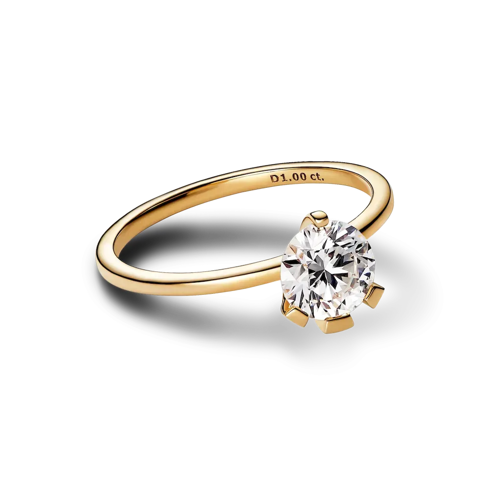 Shine in the Pandora Nova 14k Gold Lab-grown Diamond Ring. Inspired by the illusion of capturing and holding a precious fragment of light, this 14k gold ring showcases a 1.00 carat round brilliant excellent cut lab-grown diamond. The unique asymmetric prong setting opens the stone to the light for ultimate sparkle. A symbol of the unique light within all of us, this eye-catching lab-grown diamond ring is a piece to be worn and treasured for years to come – by you or someone who brings light into your world. Each Pandora Lab-grown diamond is treated with a post-growth color enhancement called annealing.