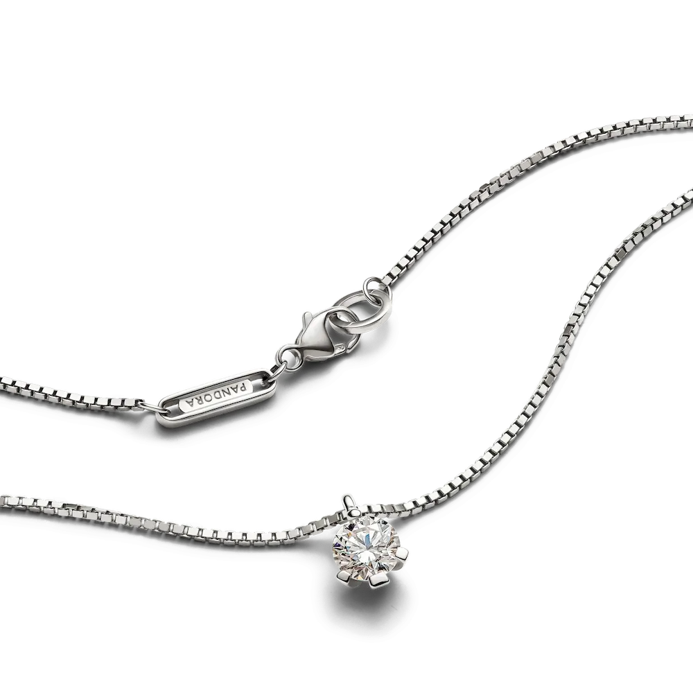 Shine in the Pandora Nova 14k White Gold Lab-grown Diamond Pendant Necklace. Inspired by the illusion of capturing and holding a precious fragment of light, this luminous lab-grown diamond necklace features a 0.50 carat round brilliant excellent cut lab-grown diamond set in 14k white gold. An asymmetrical prong setting frames the stone and is attached to the chain with a hidden jump ring, making the pendant appear to float on the neckline. The 14k white gold necklace chain is adjustable to two lengths. Wear it as a symbol of the unique light within all of us. Each Pandora Lab-grown diamond is treated with a post-growth color enhancement called annealing.