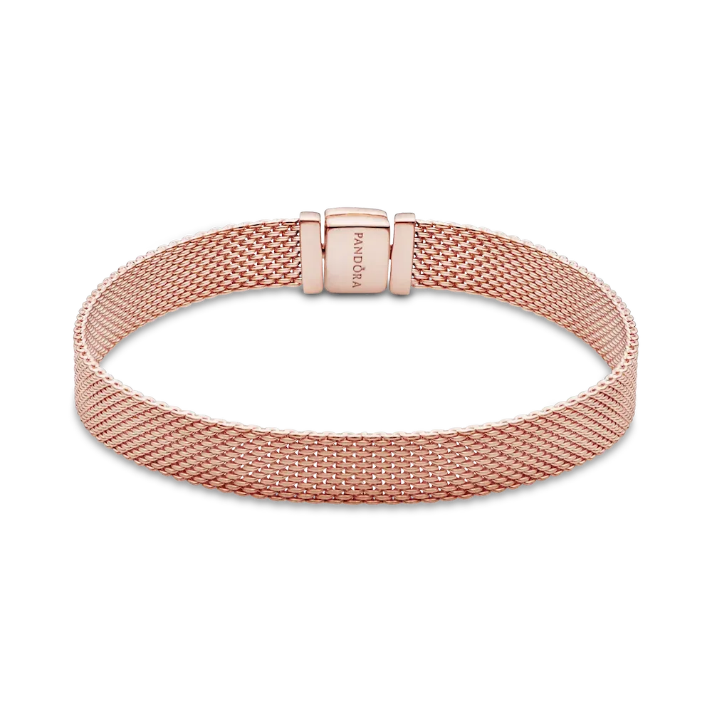 Pandora Reflexions is a modern way to reflect who you are. The Reflexions Mesh Bracelet holds clip-on charms that sit flush to mirror your style – whatever shape it takes. Plated with 14k rose gold for a blush-pink finish, this piece looks equally cool worn alone or stacked with other bracelets. Weave your story into your style and go gold and bold, adding your favourite charms from the collection.