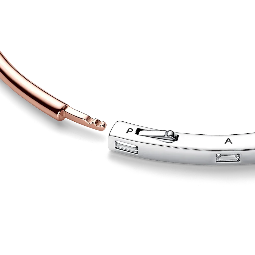 Make minimal stacking your mantra with the Pandora Signature Two-tone I-D PavĂ© Bangle. The minimalist bracelet is crafted from two metal finishes; sterling silver and a 14k rose gold-plated unique metal blend. The band’s profile transitions from square to round; the squared half features evenly spaced sparkling baguette stones, while the rounded part is warm-toned. The engraved logo on the side corresponds with the placement of the baguette stones. The unique hinge and click closure clasp make it easy to wear and remove this Pandora bangle bracelet. Wear alone as your signature piece, or stack multiple bracelets for a bold look.