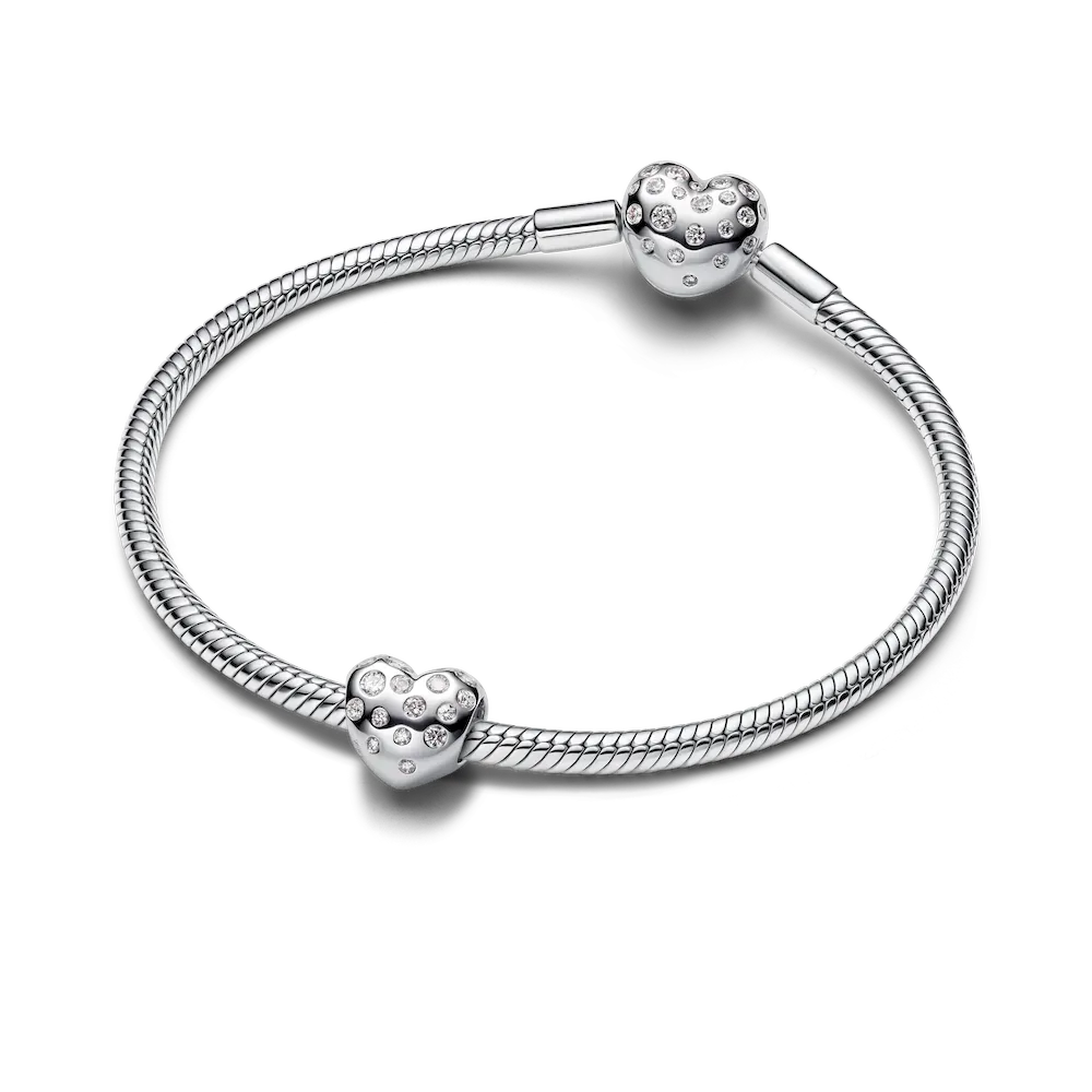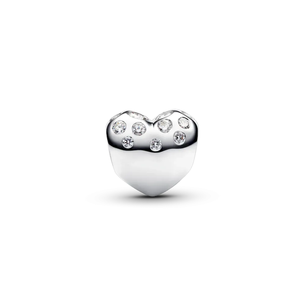 Radiate love with our Heart Charm. Crafted from sterling silver, this meaningful heart-shaped piece features 27 flush-set lab-grown diamonds of different shapes and sizes that scatter across its surface. All finished with a Pandora logo on the back of the charm. The sprinkle of lab-grown diamonds was inspired by shafts of morning light, new days and new beginnings. Wear yours as a precious symbol of all that you love and all that lies ahead of you. To ensure our rigorous standards of quality in color and clarity, each lab-grown diamond has undergone an additional high heat and pressure treatment prior to cutting and polishing.