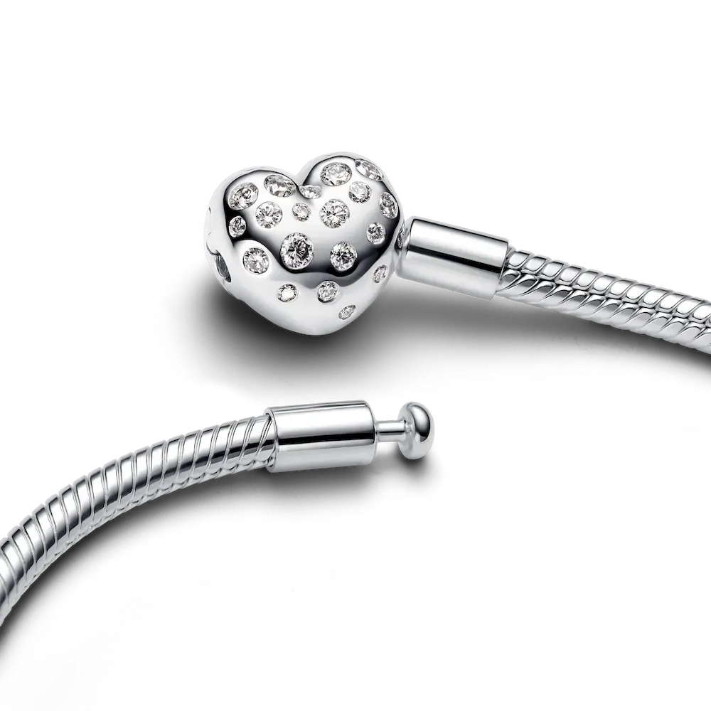 Radiate love with our Pandora Sterling Silver Lab-grown Diamond Heart Clasp Snake Chain Bracelet. Crafted from sterling silver, this meaningful bracelet meets at the center with a heart-shaped clasp, featuring 29 flush-set lab-grown diamonds of different shapes and sizes that scatter across its surface. The sprinkling of lab-grown diamonds was inspired by shafts of morning light, new days and new beginnings. Style with a maximum of 16-18 of your favorite charms and dangle charms, to create a reminder of all that you love and all that lies ahead of you. To ensure our rigorous standards of quality in color and clarity, each lab-grown diamond has undergone an additional high heat and pressure treatment prior to cutting and polishing.