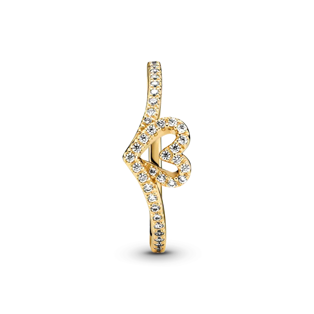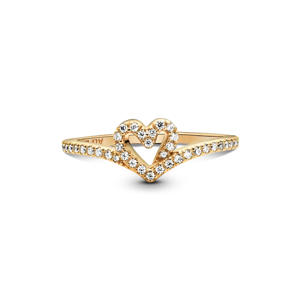 Surprise the one you love with our Sparkling Wishbone Heart Ring. Hand-finished in 14k gold plating, this piece is inspired by classic Pandora design elements. The heart detail has been incorporated into our iconic V-shape, creating a design ready to be adored. Clear cubic zirconia decorate the heart and top of the ring band. Present this style to someone special to show how much you care.