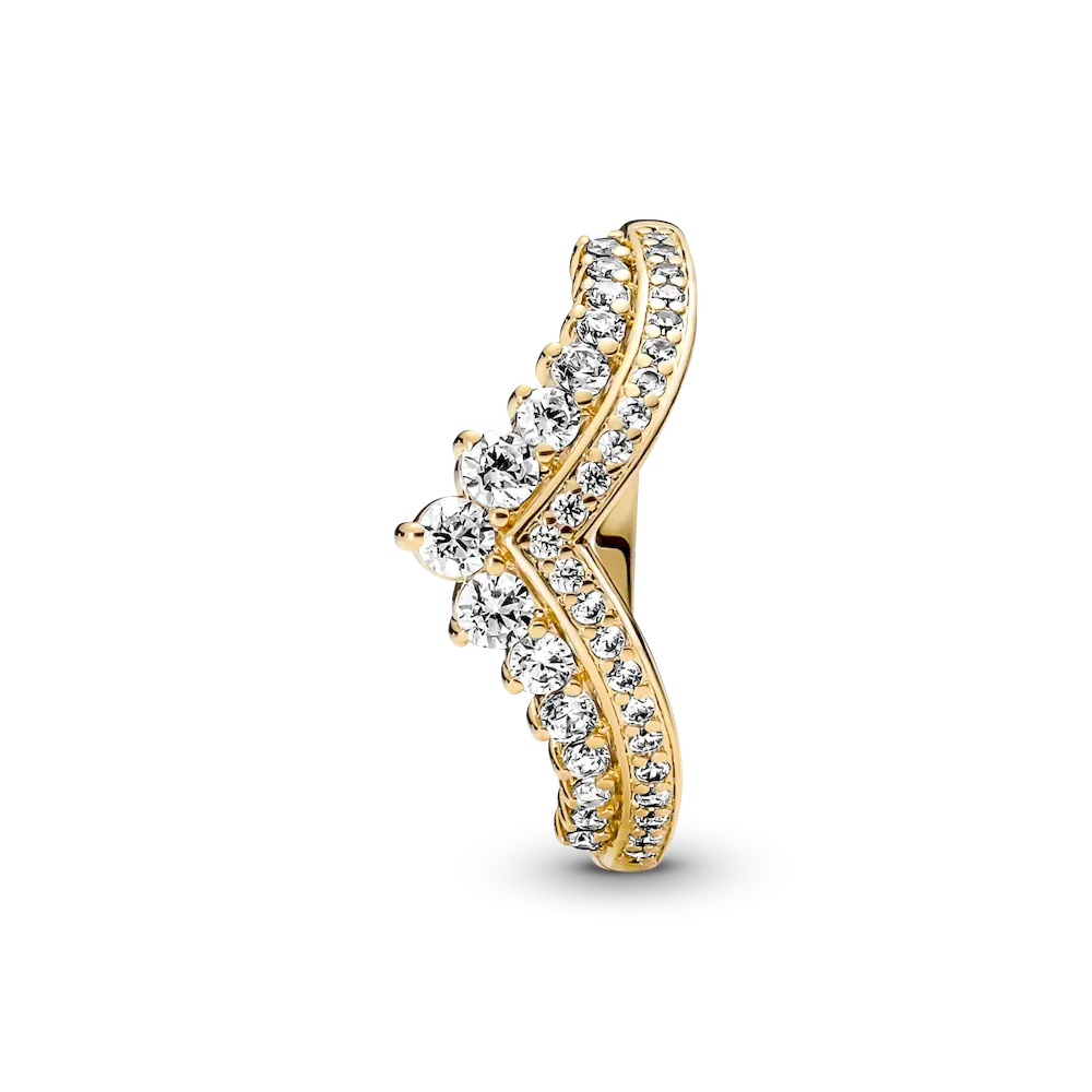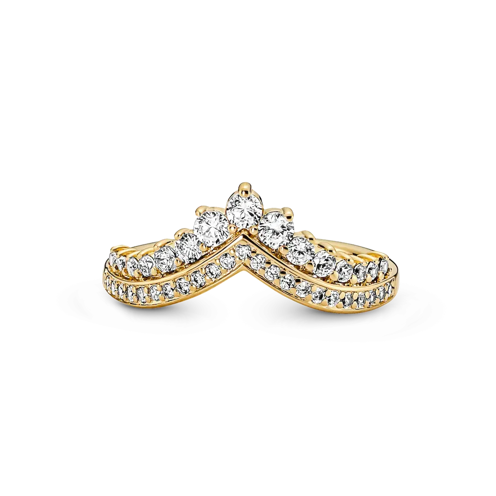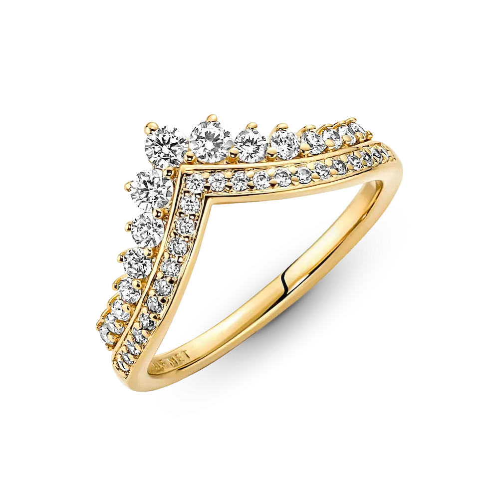 Let even more radiance into your ring styling with this glittering tiara ring, fit for a modern-day princess. Inspired by royal headpieces from across history, this 14k gold-plated wishbone ring will add a regal feel to your everyday looks. Set with rows of glittering cubic zirconia in classic settings, the chevron-shaped piece is sure to be the crowning glory in any ring stack.