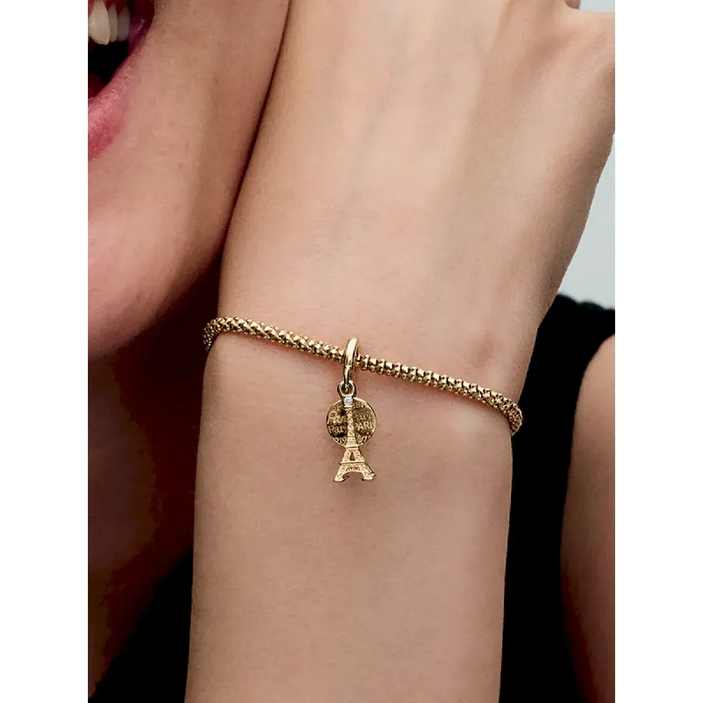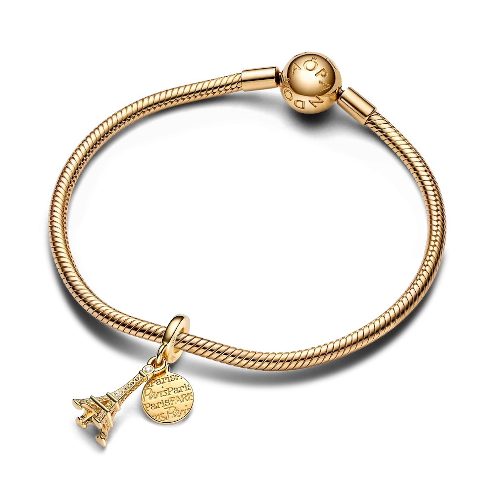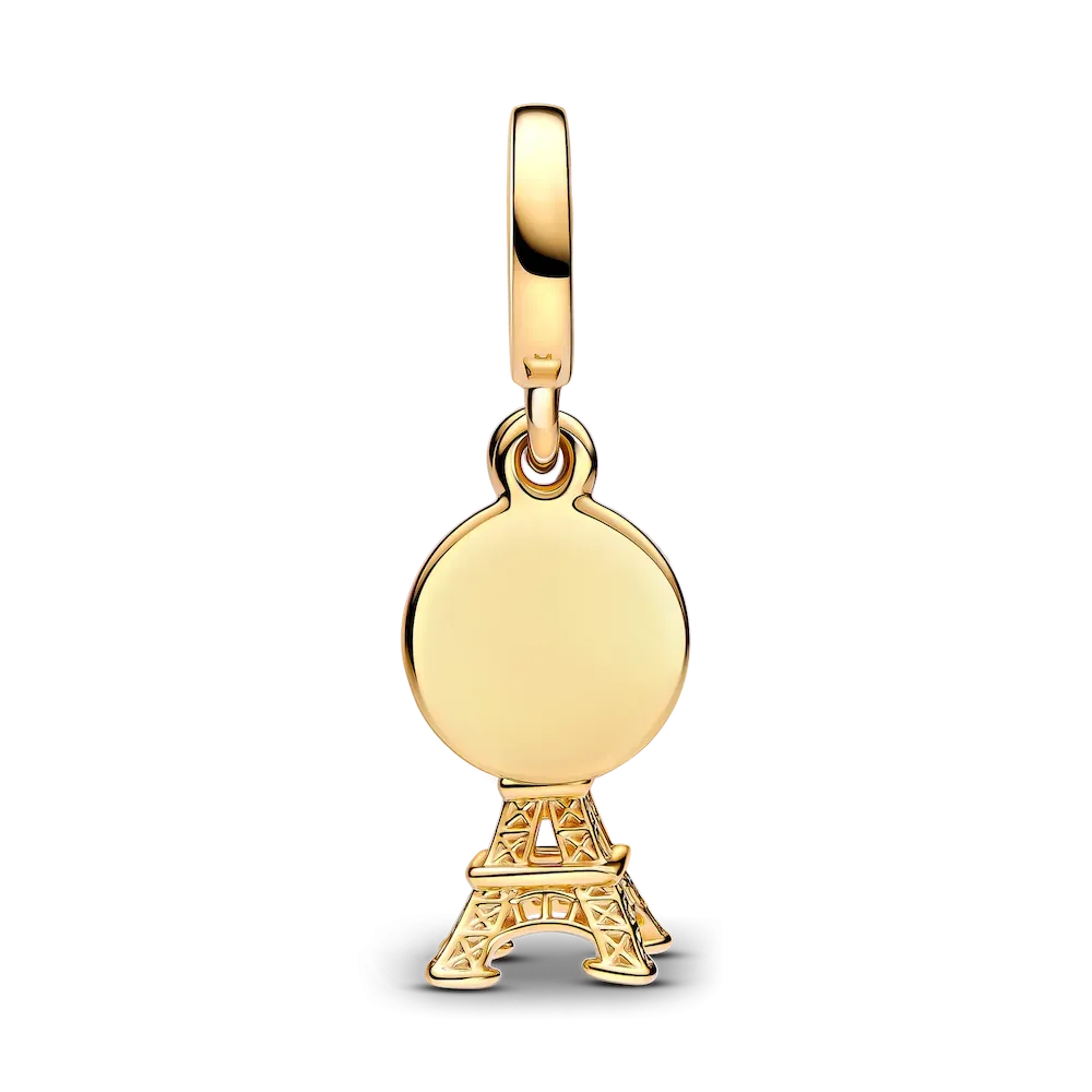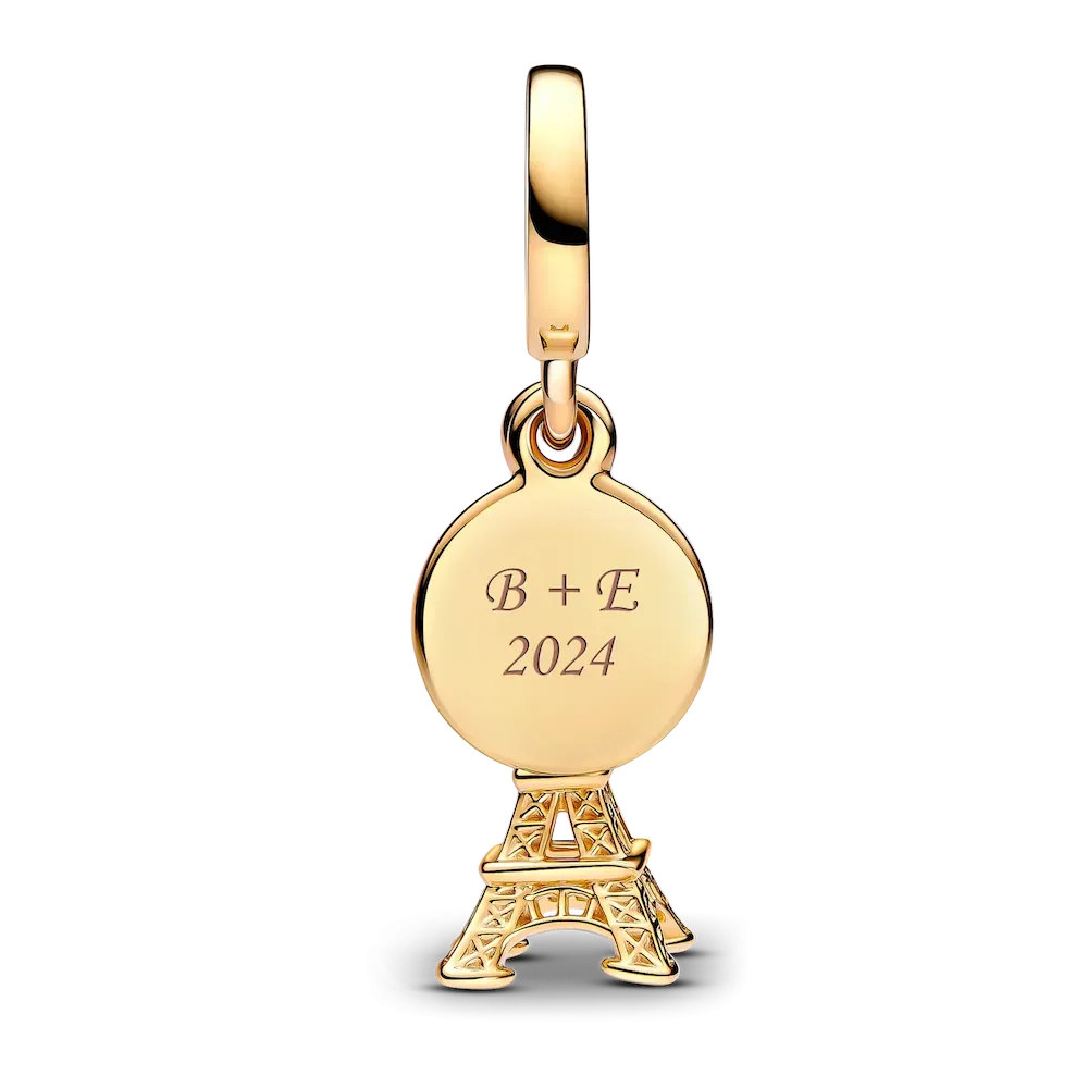 Carry a piece of Paris wherever you go with the Paris Eiffel Tower Lab-Grown Diamond Engravable Double Dangle Charm. A lab-grown diamond sparkles from the top of this tiny, intricately detailed replica of the iconic Eiffel Tower. A second dangle features a disc engraved with