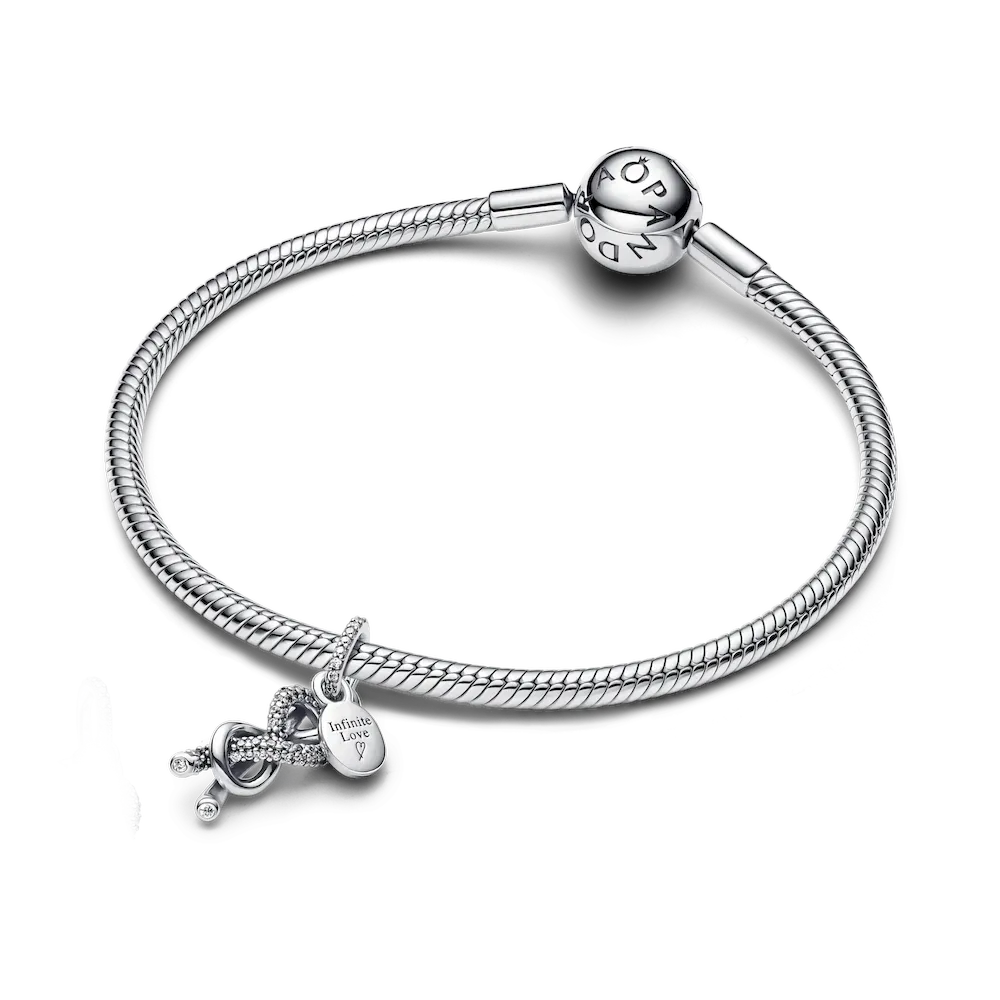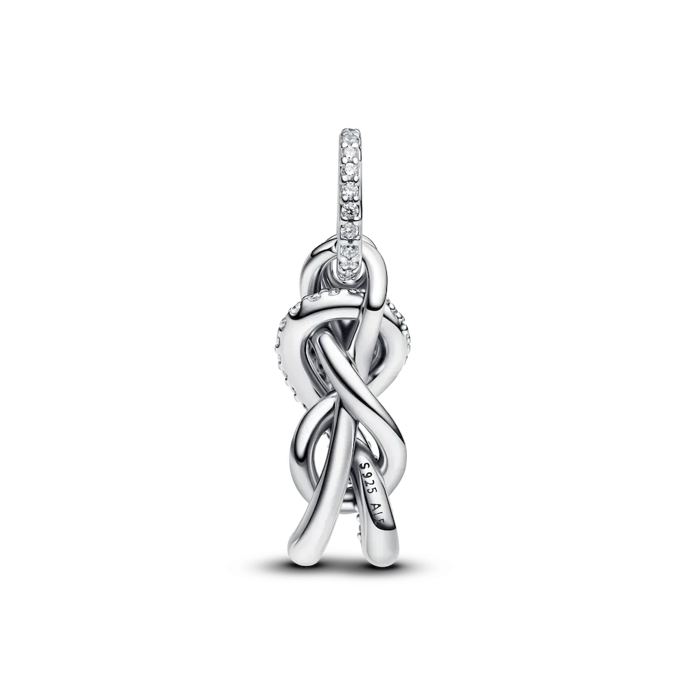 Wear a reminder that love conquers all with the Pavé Infinity Knot Dangle Charm. Hand-finished in sterling silver, this charm centres on an infinity knot symbol with along with disc dangle engraved with