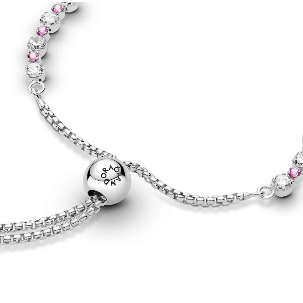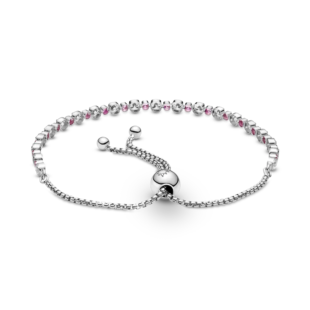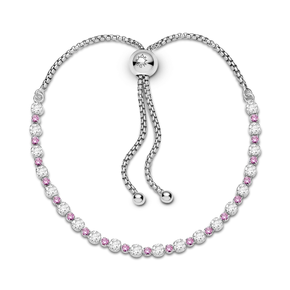 Add a sophisticated pink note to your look with this sparkling sterling silver slider bracelet. Hand-finished with two tones of shimmering details, this tennis bracelet features clear cubic zirconia and pink synthetic sapphires in alternating sizes, adding a layer of contrast to the piece. The bracelet features a handy adjustable slider clasp for a perfect fit. Add a classic and versatile staple to your collection and wear this stylish piece years to come.