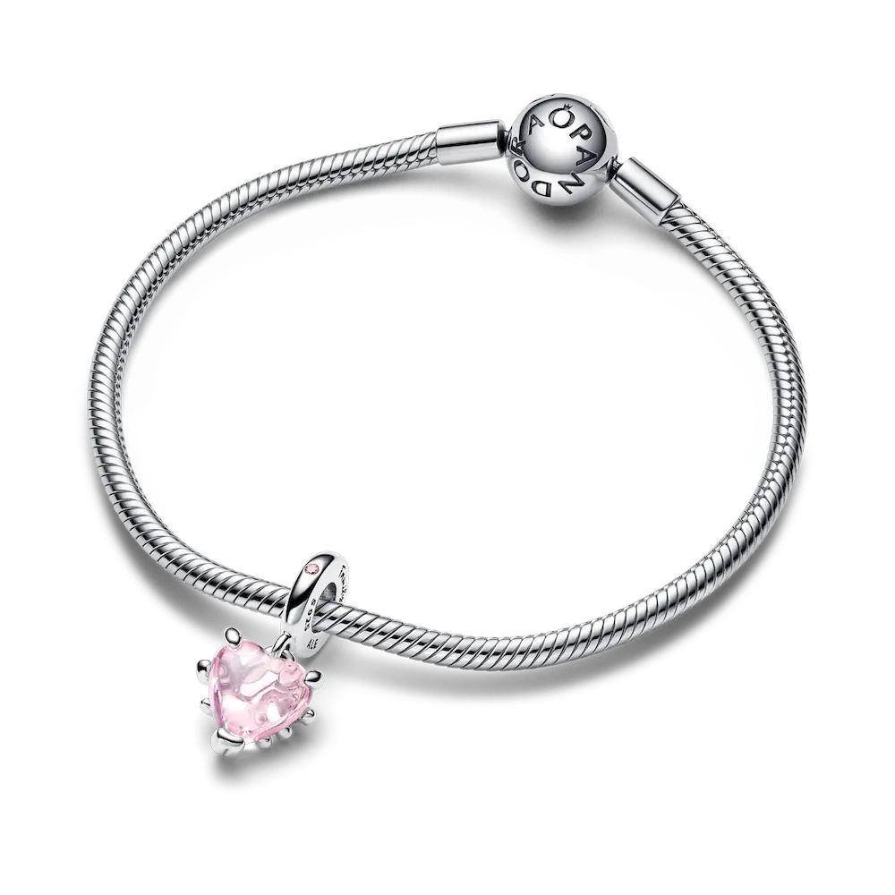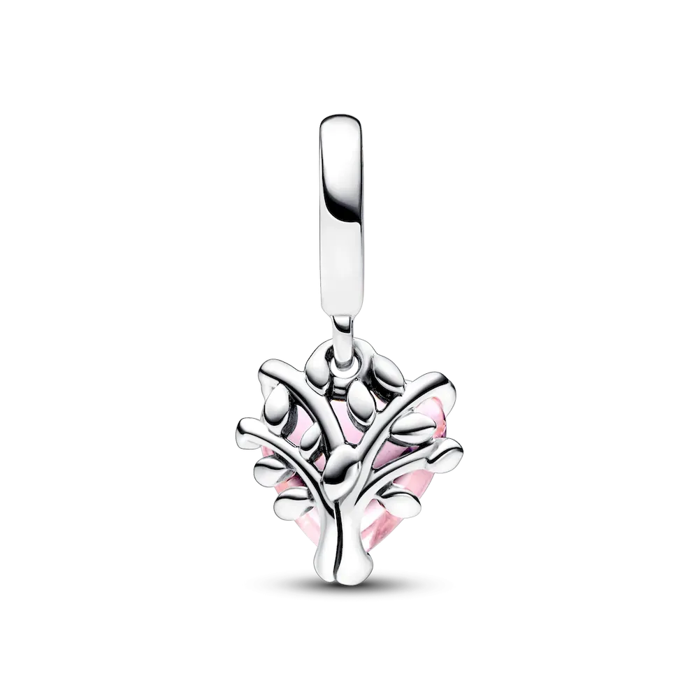 Celebrate the heart of your family with the Pink Family Tree & Heart Dangle Charm. This hand-finished dangle charm is crafted from sterling silver with a transparent pink cabochon man-made crystal shaped like a heart. On the back of the dangle, the heart is embraced by an openwork family tree motif in sterling silver, its polished branches and leaves symbolizing an eternal love that grows like a tree and nurtures the lives we touch. The bail is engraved with the word