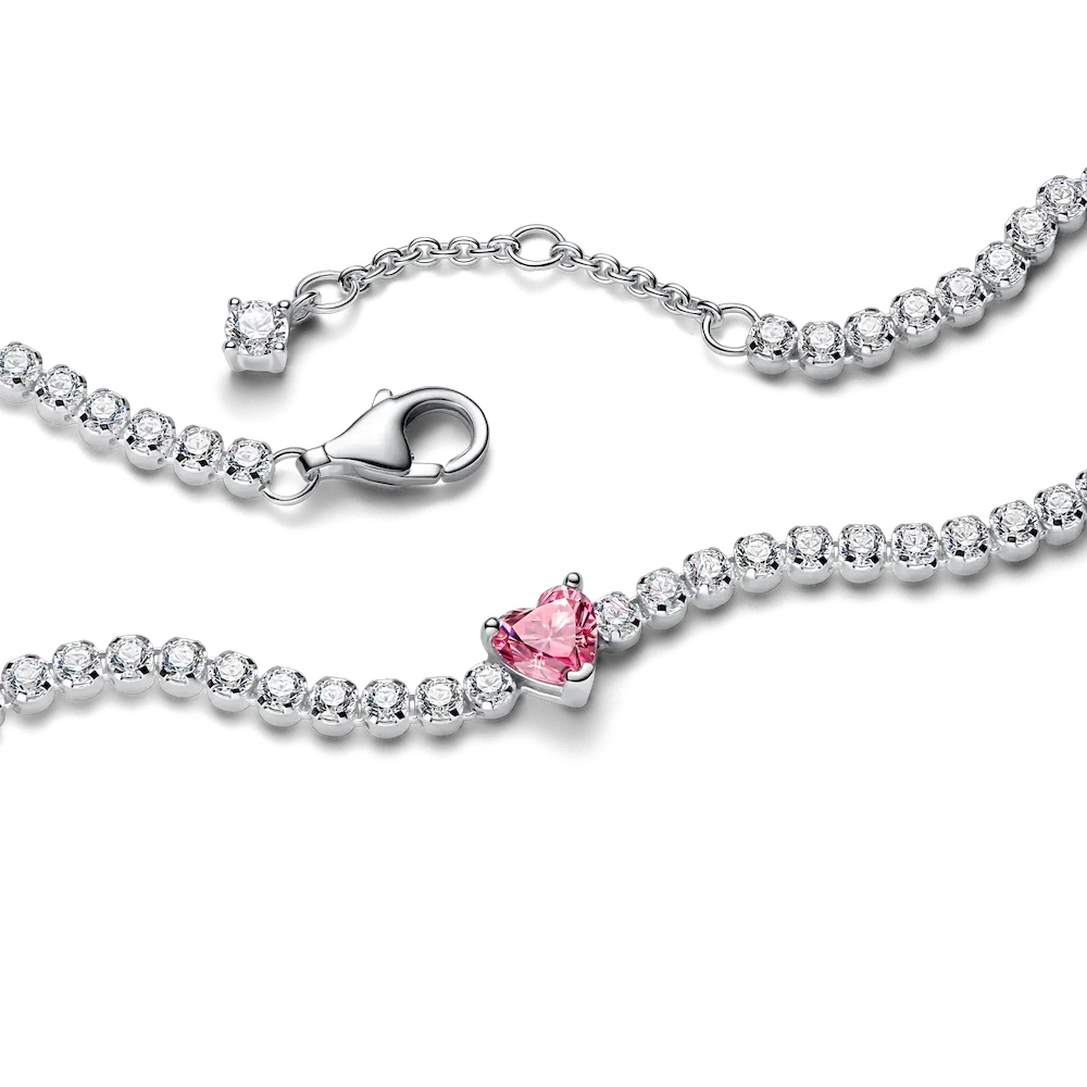 Add a pop of pink with this sterling silver set. Featuring raised heart-shaped stones and sparkling pavé, the adjustable tennis bracelet and stud earrings glow with love and gratitude.
