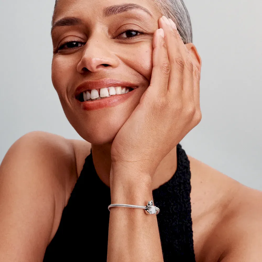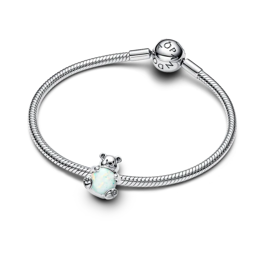 Give a warm embrace to the chilliest season with our Polar Bear Charm. A sterling silver polar bear, finished with enamel eyes, gives a big bear hug to a radiant lab-created opal resembling a snow ball. The back of the bear is engraved with