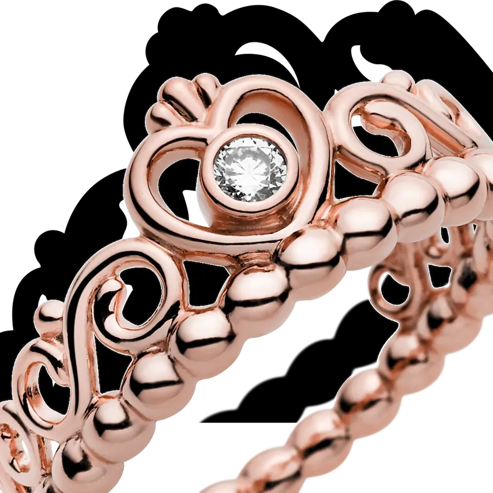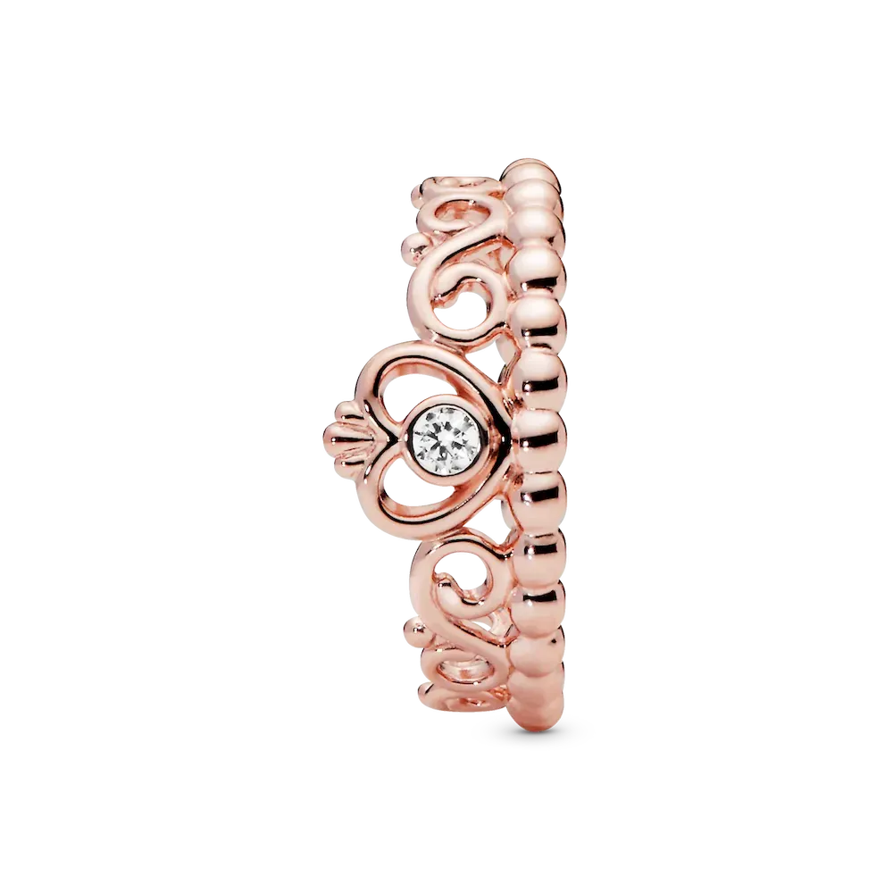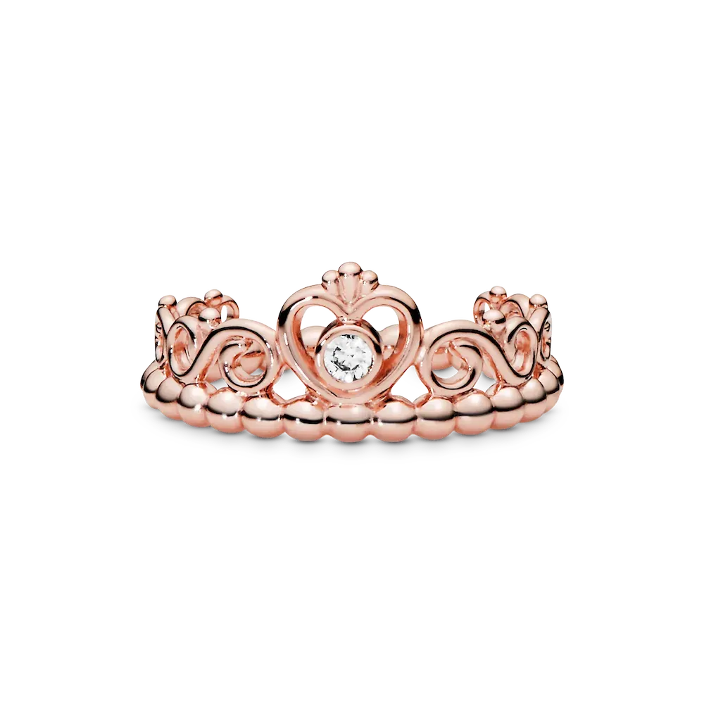 Feel like a princess every day with this magnificent Princess Tiara Crown Ring. Exquisitely plated with 14k rose gold, this enchanting style features a heart-shaped tiara design accented with a single shimmering cubic zirconia stone. Showcase the statement ring on its own or pair it with other Pandora princess rings for a fairy tale finish.
