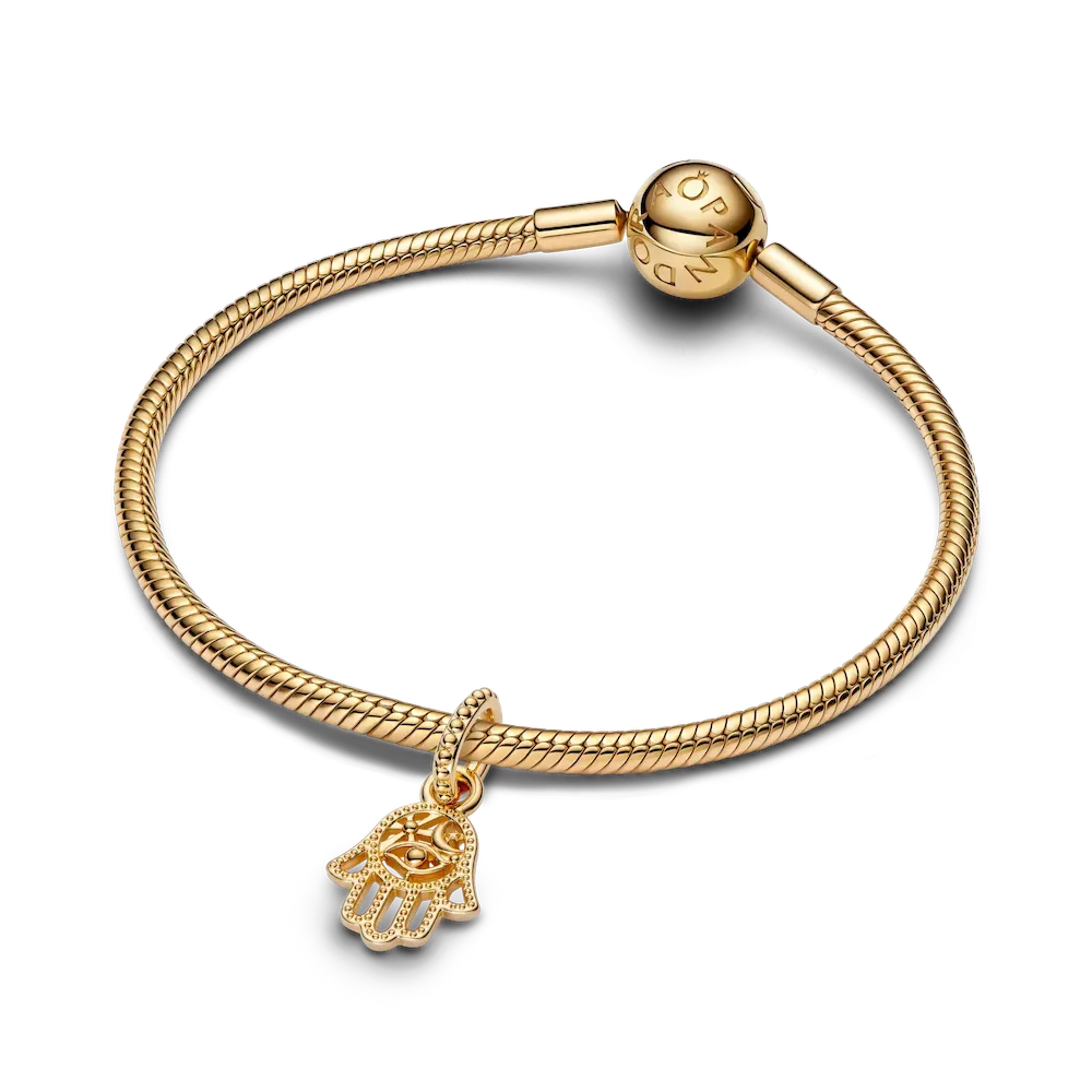 Embrace protection and positivity with this intricate charm, featuring a detailed Hamsa hand with symbolic eye and moon motifs – a meaningful nod to strength and light.