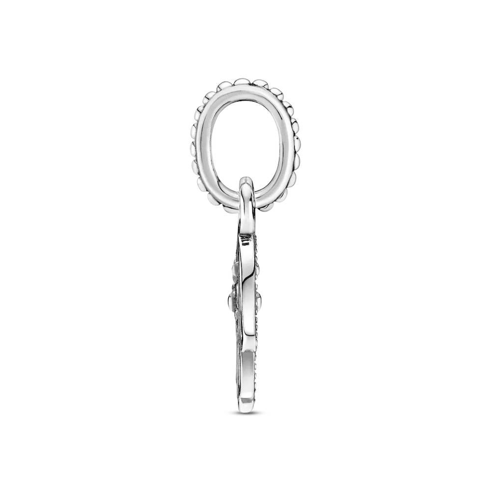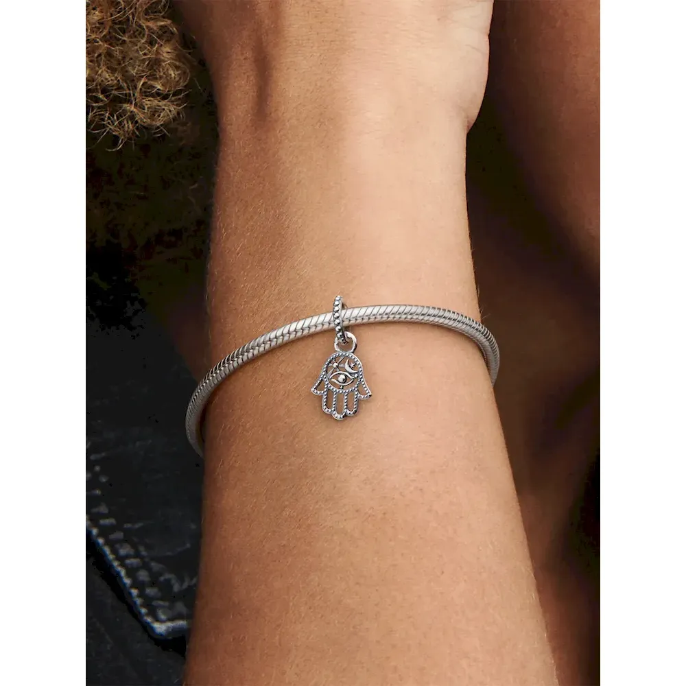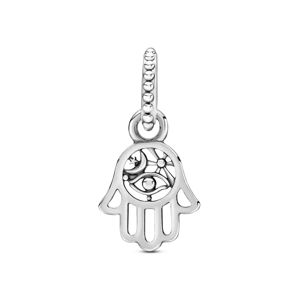 Always channel positive vibes with the Protective Hamsa Hand Dangle Charm. Hand-finished in sterling silver, this Hamsa charm features an intricate openwork design and hangs from a beaded bail. An eye, rays and crescent moon motifs feature inside the hand, which includes beading along its outline as a reference to signature Pandora design. A talisman to defend against evil, the dangling hand is seen as a gesture of welcoming an abundance of goodness, kindness, friendship and grace into your life.