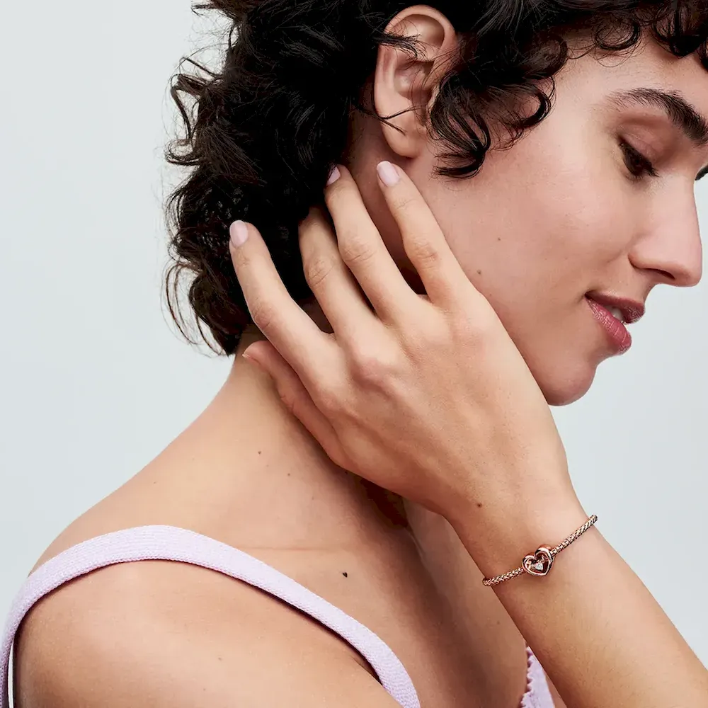 What the heart wants. Inspired by the joining of two hands to form a heart gesture, our Radiant Heart & Floating Stone Charm makes a sweet statement about the power of love. Hand-finished in 14k rose gold plating, a 3D open heart reveals a dangling heart-shaped faceted cubic zirconia within, sparkling as it catches the light. Gift it to the one who completes you.