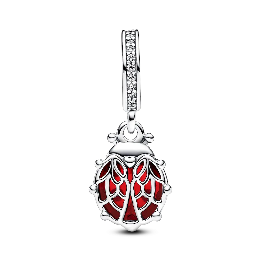 Reconnect with nature this spring with our Red Ladybird Dangle Charm. A universal symbol of hope and luck, this ladybird charm features a sterling silver cut-out wing pattern that shines through an opaque red stone. The ladybird’s characteristic spots are carved into the stone and then filled with black enamel to create a realistic shell. Adding a touch of sparkle, the ladybird dangles from a bail set with a row of pavé. Wear it on your favourite Pandora Moments charm holder to bring your styling to life.