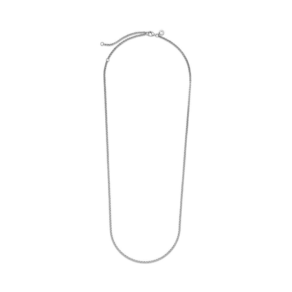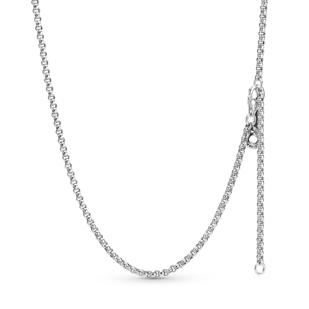 Discover a new way to wear your go-to charms with the Rolo Chain Necklace. Hand-finished in sterling silver, this simple design is adjustable to three different lengths. This piece can only be worn with small and medium-sized Pandora O Pendants. Attach a pendant with a sparkling ball clasp to make a statement. Team with sterling silver earrings decorated with stones for a uniform look with added shine.