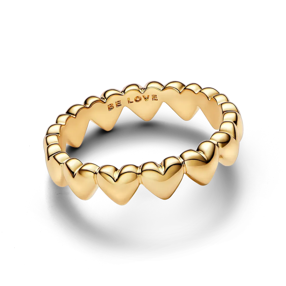 Give a gift from the heart with this 14k gold-plated ring. Expertly crafted with a row of hearts making up the band, this romantic design looks equally beautiful worn on its own or layered with contrasting Pandora rings. Give it as a gift for a meaningful way to express your love, or treat yourself to a piece you’ll love wearing over and over.