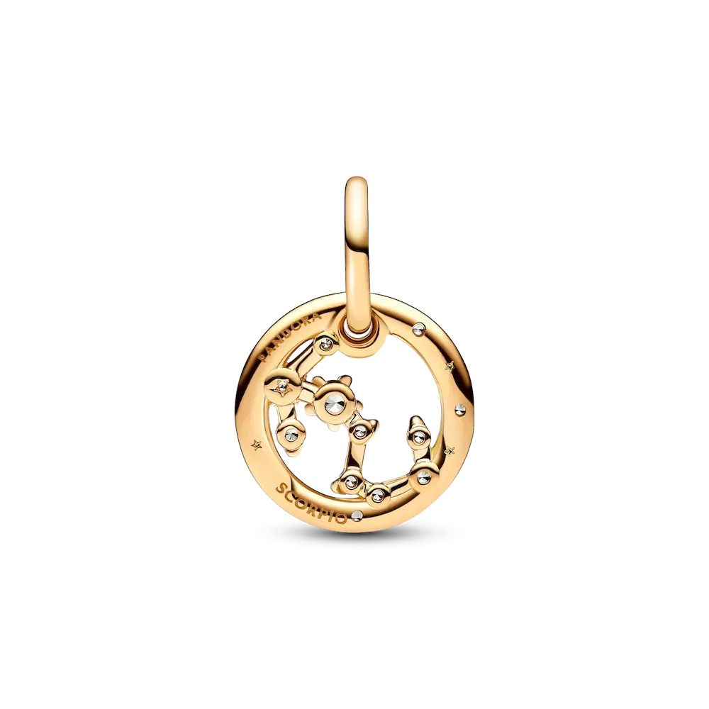 Let the stars guide your look with the Pandora Scorpio Zodiac Dangle Charm. This Scorpio charm is crafted our 14k gold-plated unique metal blend, has a circular outer frame and features clear sparkling cubic zirconia as well as the shape of the Scorpio zodiac sign. The back side of the frame is engraved with