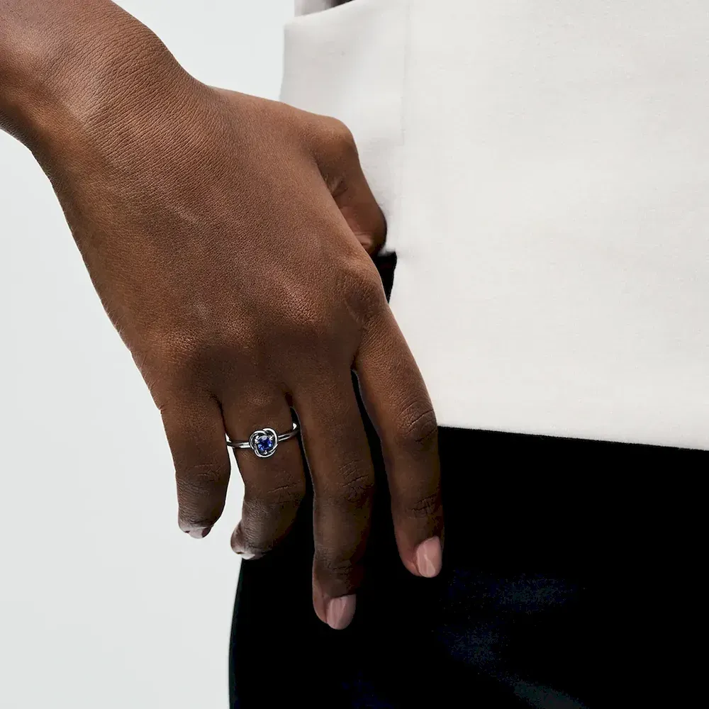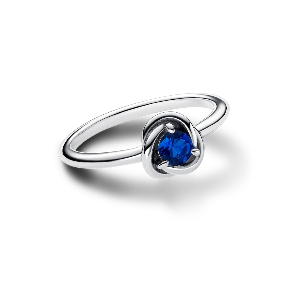 Wear a symbol of forever with the Blue Eternity Circle Ring. This sterling silver ring features one claw-set sparkling blue man-made crystal. The polished band wraps around the center stone in an openwork braided infinity pattern. Whether you want to carry a reminder of eternal love or a symbol of the timeless joy that infuses each and every moment, this colorful eternity ring will bring sparkling meaning to your look.