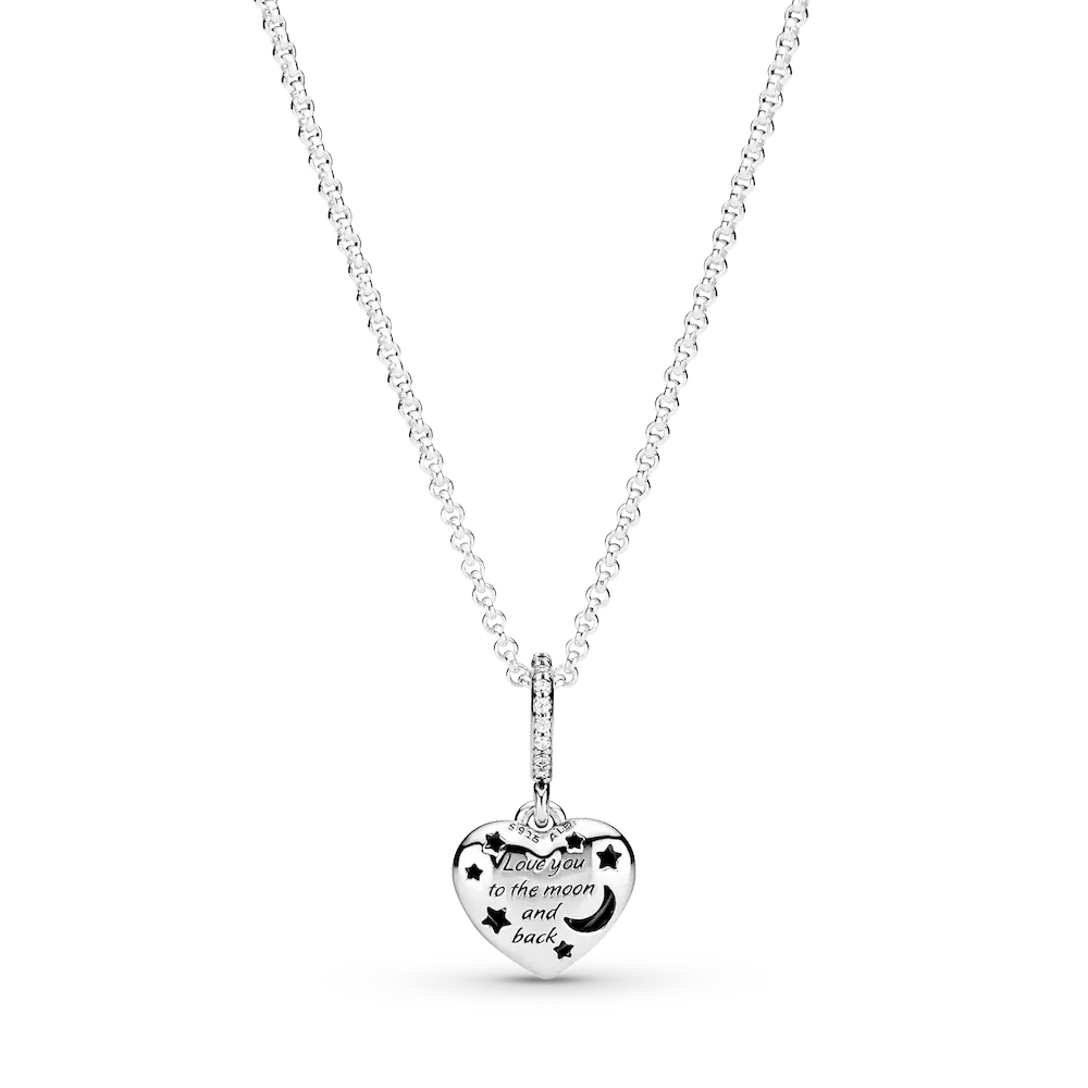 Celebrate the beautiful night sky with the Sparkling Blue Moon & Stars Heart Necklace. Hand-finished in sterling silver, this heart-shaped pendant is decorated with blue stones, silver stars and features a half-moon stone, which is a brand-new addition to Pandora jewelry. Including cut-out moons and stars, there’s the engraving “Love you to the moon and back” on the reverse. Adjustable in length, a dangling moon and a Pandora crown O monogram logo tag feature at the ends of the chain. Show someone special you appreciate them with this celestial pendant.
