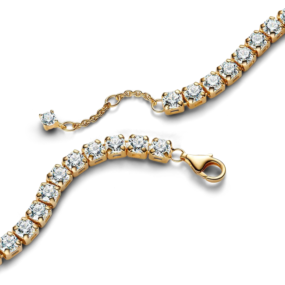Celebrate life’s special moments with a radiant tennis bracelet. Set with stones all the way around and plated with 14k gold, it delivers a truly timeless look on and off court.