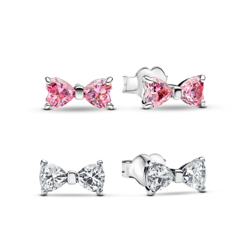 The Sparkling Bow Stud Earrings from Pandora feature delicate sterling silver bows adorned with cubic zirconia stones for a touch of elegance. The Sparkling Pink Bow Earrings add a soft pink hue, while the Sparkling Small Bow Earrings offer a clear, versatile sparkle—both perfect for adding playful refinement to any look. These earrings are also ideal for stacking, allowing you to mix and match for a personalized and stylish ear party.