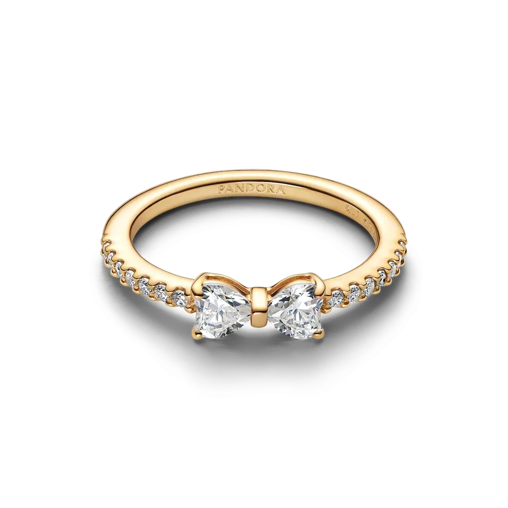 A dainty bow design formed by two heart-shaped stones sits at the centre of this sparkling ring, blending sweetness and elegance for a striking look.