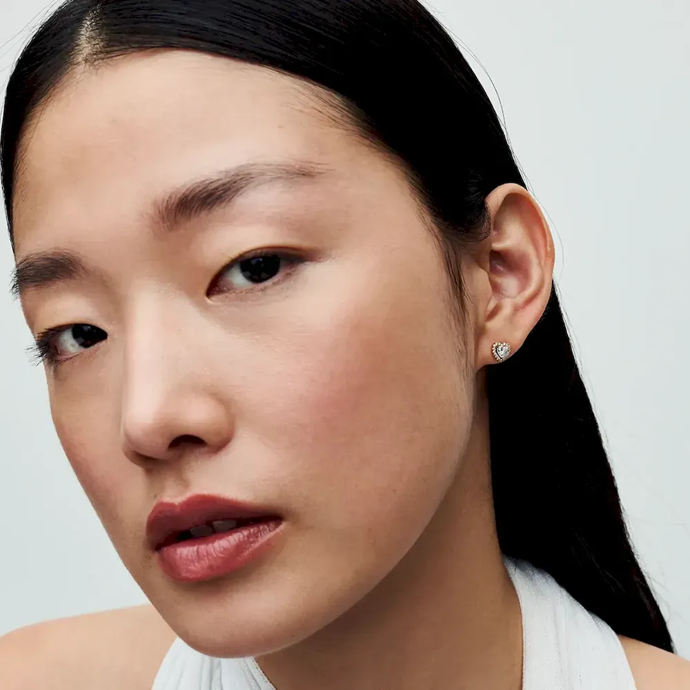 Wear a timeless classic with these Sparkling Elevated Heart Stud Earrings. Hand-finished, these 14k gold-plated studs are inspired by the look of the classic Pandora Timeless collection. Each earring features a raised clear heart-shaped stone surrounded by a halo of clear cubic zirconia, creating contrast with the warm tones of 14k gold plating. Continue this effect across your look by styling these earrings with the matching Sparkling Heart Collier Necklace.