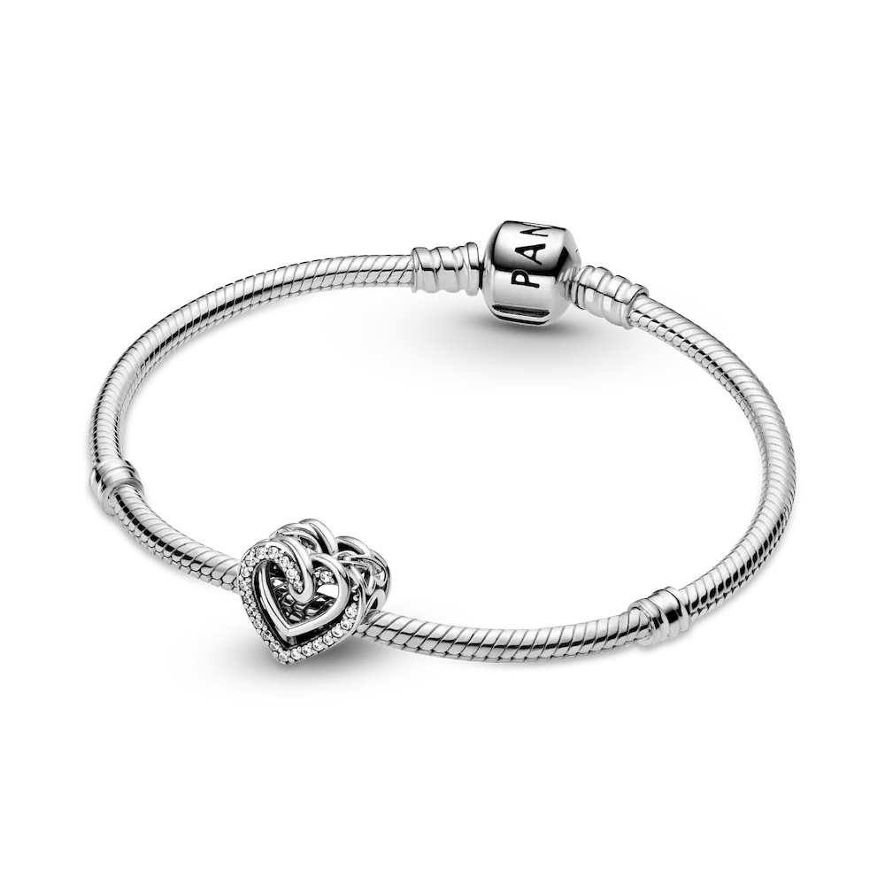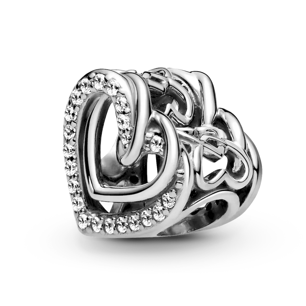 Gift a symbol of your love with the Sparkling Entwined Hearts Charm. Hand-finished in sterling silver, this design includes intertwining polished sterling silver hearts and sparkling stone-embellished hearts on the front and back. Entwined hearts also feature on the sides. Inspired by the famous love story of Romeo & Juliet, present this detailed openwork charm to someone special for Valentine’s Day.