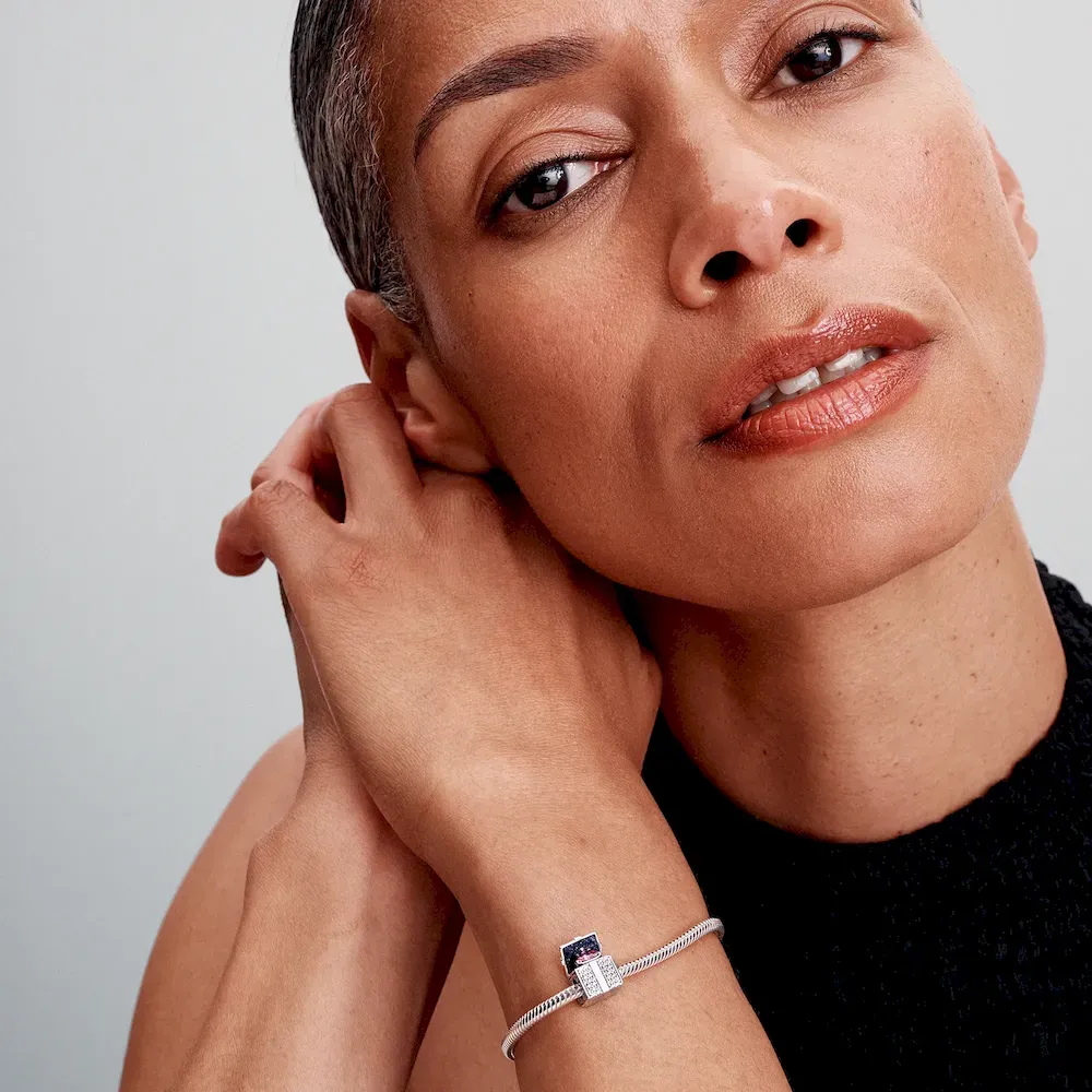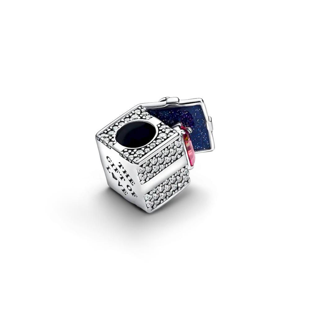 Unbox the holidays with our Sparkling Gift Box Charm. The open sterling silver box is complete with a bow, ribbon details, glittering pavé and a radiant red heart-shaped stone. The bottom of the box features the engraved message