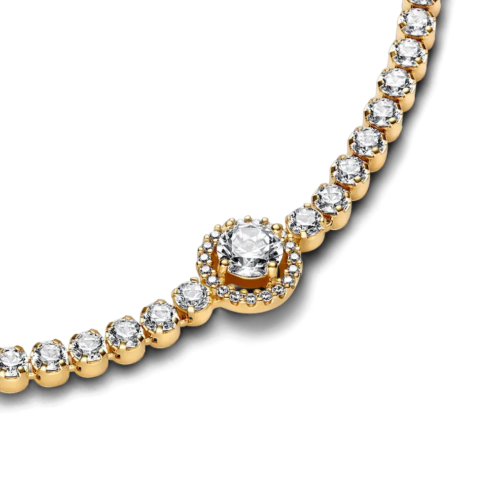Level up your outfit with the Sparkling Halo Tennis Bracelet. Finished in elegant 14k gold plating, this hand-finished piece is decorated with sparkling stones. The centerpiece features a big central stone surrounded by a halo of clear cubic zirconia. There’s a small stone detail at the end of the chain for added sparkle. This tennis bracelet includes a lobster clasp for safe closure. Style with other shimmering Pandora Timeless pieces for a classic look that stands out.