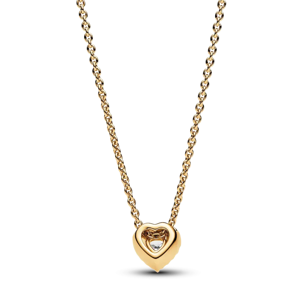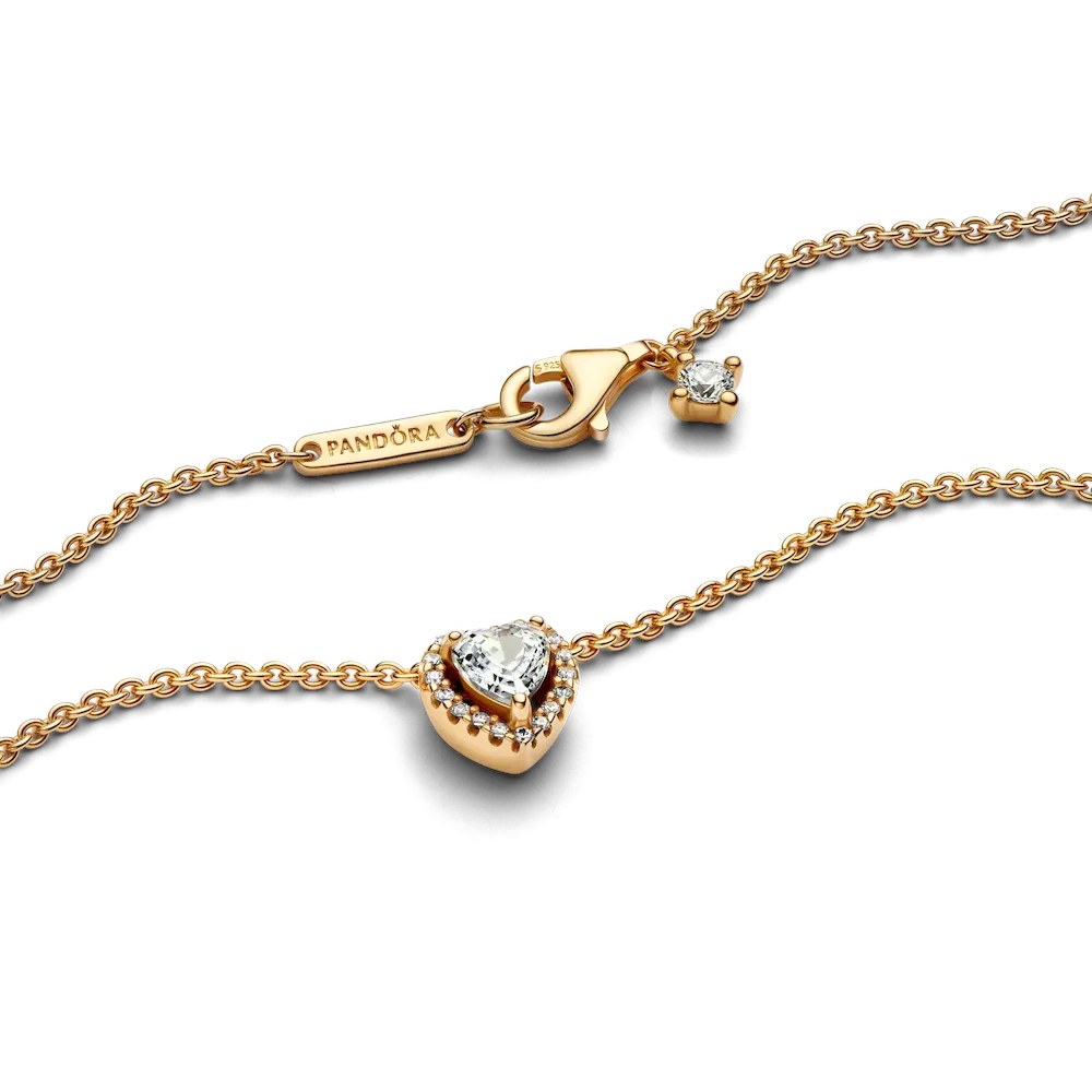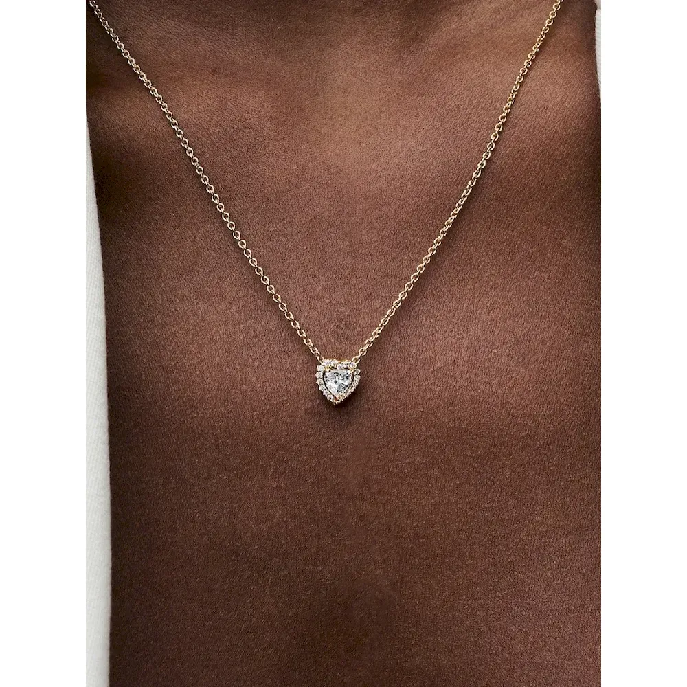 Make a statement with the Sparkling Heart Collier Necklace. This 14k gold-plated necklace is inspired by classic design elements from the Pandora Timeless collection. Featuring a raised heart-shaped central stone surrounded by a halo of clear cubic zirconia, the necklace also has a rectangular tag near the clasp with an engraved Pandora logo. Adjust the necklace length to suit your style and wear with other heart-shaped pieces for a look filled with love.