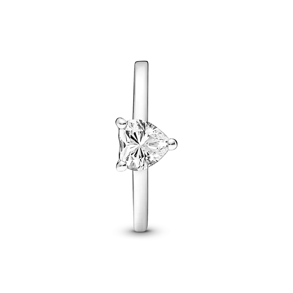 The latest addition to our solitaire collection, the Sparkling Heart Solitaire Ring features a heart-shaped clear cubic zirconia as the centerpiece. The Pandora logo is engraved on the inside of the polished shank. Stack this ring with other sterling silver pieces for a monochromatic look or mix metal finishes to make a unique statement.