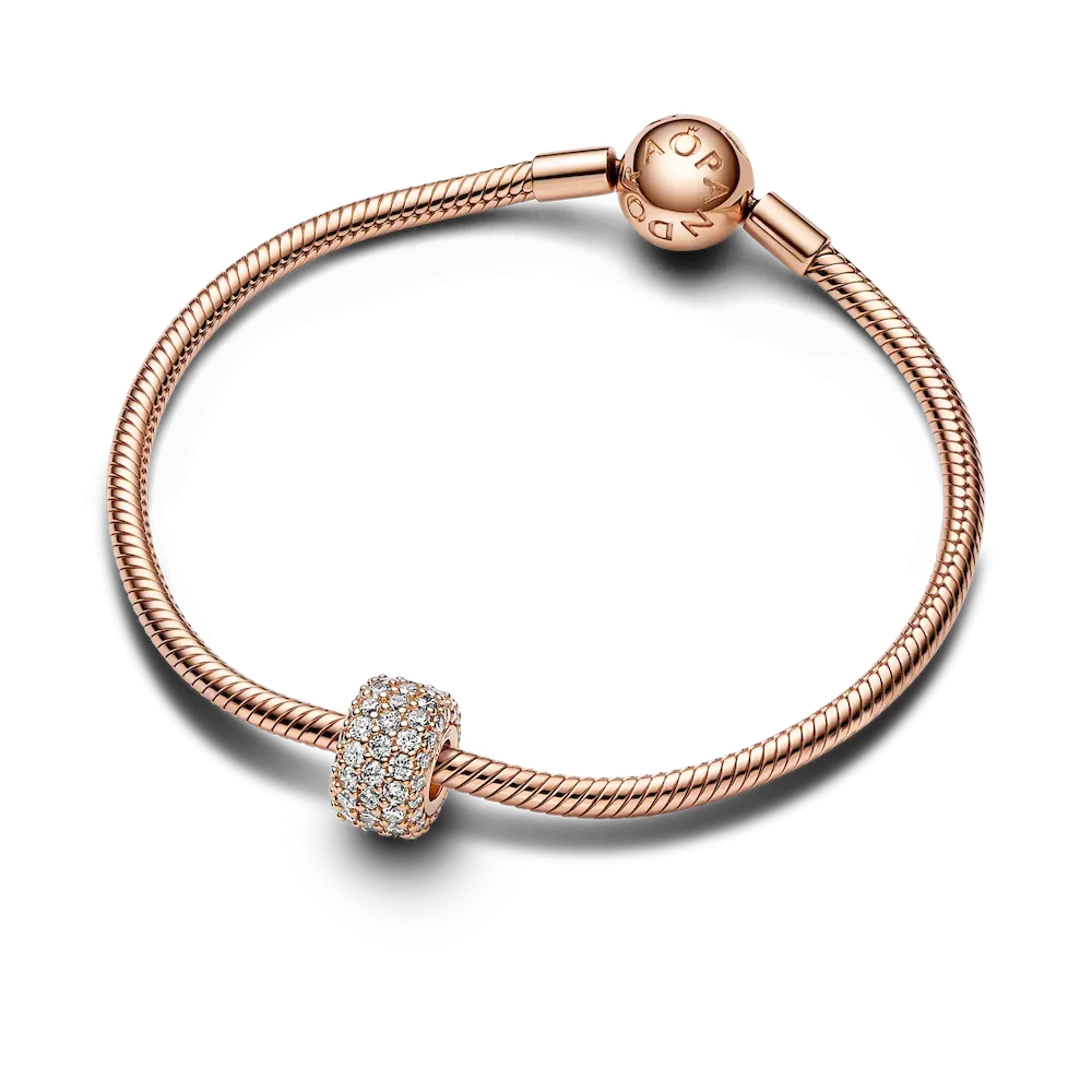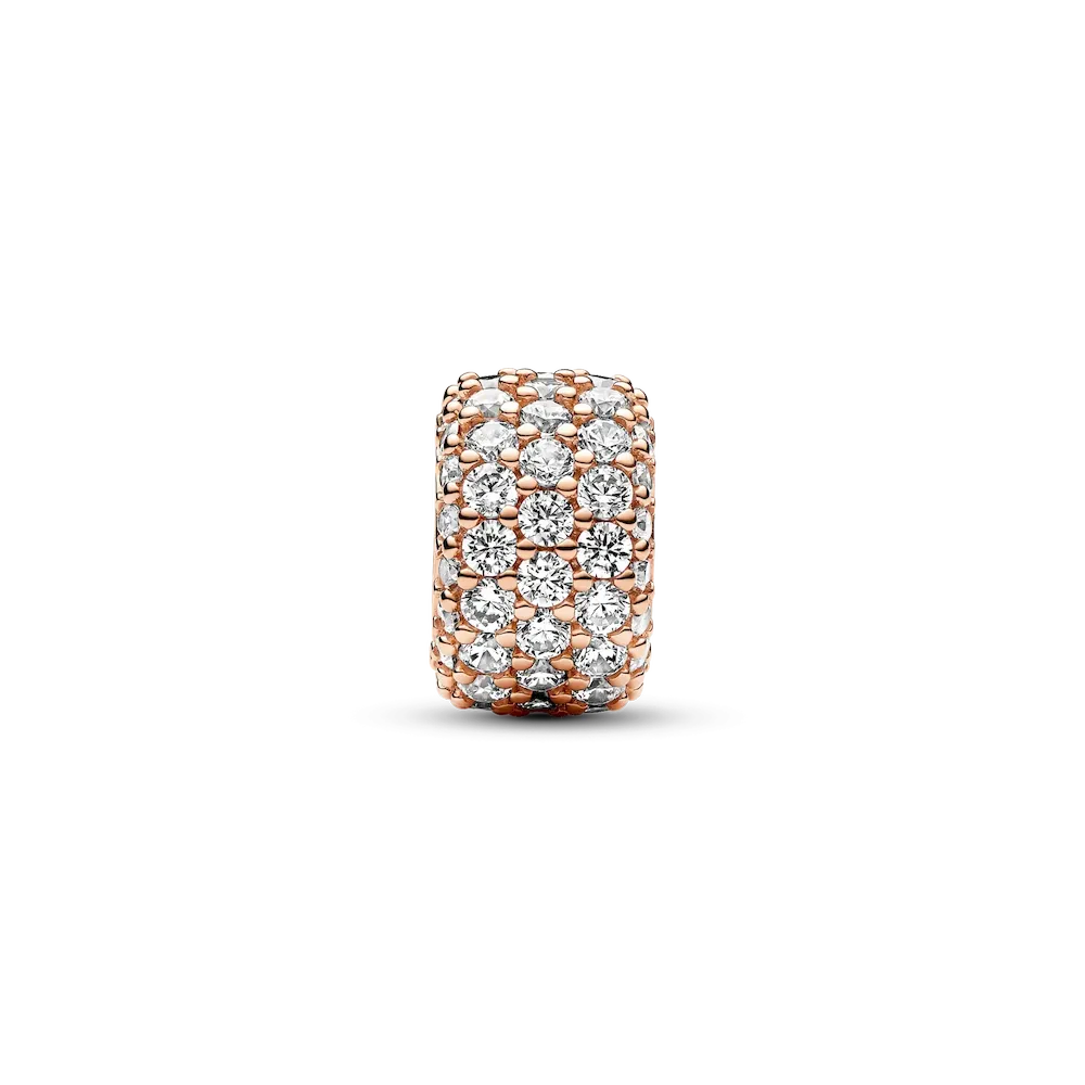 Shine bright from all angles with the Sparkling Pavé Triple-row Charm from the Pandora Moments collection. This cubic zirconia charm is made from a 14k rose gold-plated metal and is designed to shine on its own, or next to one of your existing 14k rose gold-plated charms. Crafted from exactly 85 pavé-set round brilliant-cut clear cubic zirconia, this sparkling pavé charm lends an elevated sparkle to the everyday.