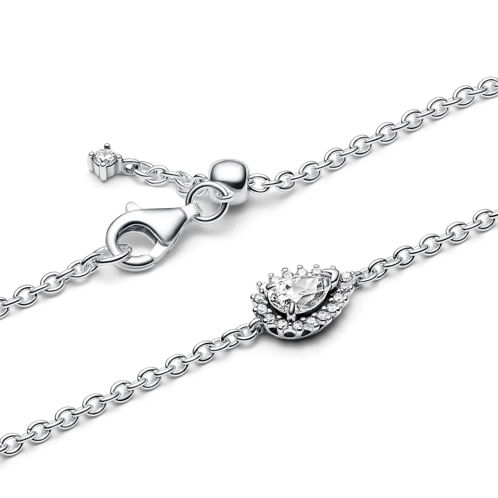 Shine brighter than ever when you wear the Sparkling Pear Halo Chain Bracelet. This bracelet features a striking pear-shaped stone raised slightly above a delicate pavé halo. A V-shaped prong and two round prongs hold the center stone in place, while a clasp with an adjustable silicone ball keeps your bracelet secure. A small stone dangles from one end of the chain. A reimagined classic with ample sparkle and dimension, this sterling silver chain bracelet makes a stunning statement and a perfect gift.