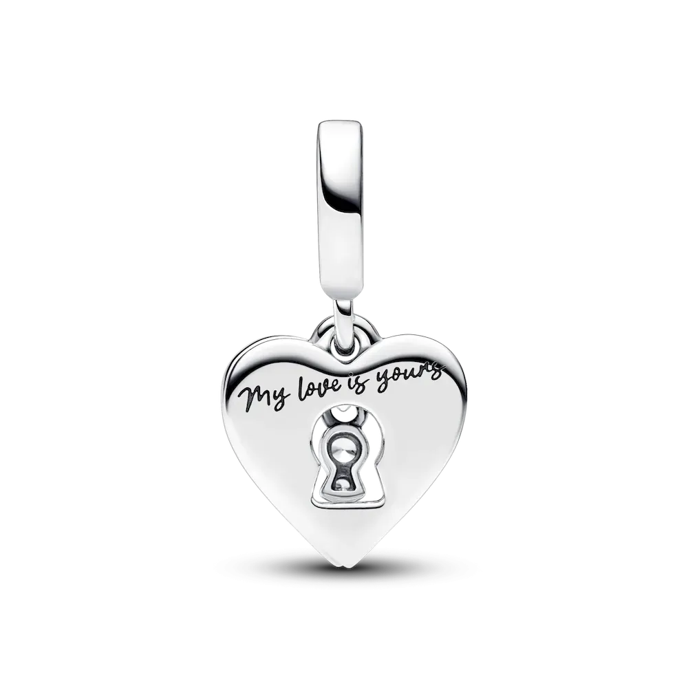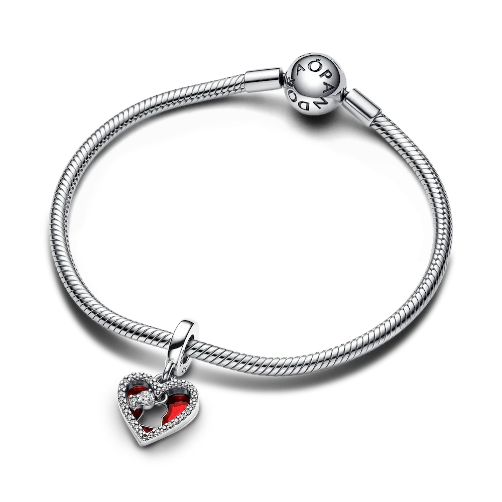 Celebrate love at first sight with our Sparkling Red Heart Dangle Charm Trio. The Red Heart & Keyhole Dangle Charm features a pavé-set heart outline over a second heart-shaped disk with vibrant red enamel. It pairs perfectly with the two dazzling, red, man-made crystals set in our Sparkling Levelled Heart Charm. The sterling silver Handwritten Love Charm adds a personal touch to this trio with an openwork design featuring the word