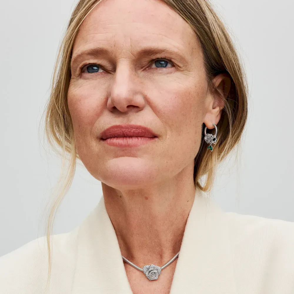 Embody floral elegance of our Sparkling Rose in Bloom Charm, a symbolic piece crafted in sterling silver. Intricately designed to capture the delicate nature of the flower, the charm features a layered petal effect to reflect the beauty of a rose in bloom and is covered with sparkling pavé. To lend an air of life-like details and movement, two green stones dangle beneath the flower representing leaves. Perfect as a gesture of love for someone close or as a meaningful addition to your collection, this Pandora rose charm is sure to keep the romance alive.