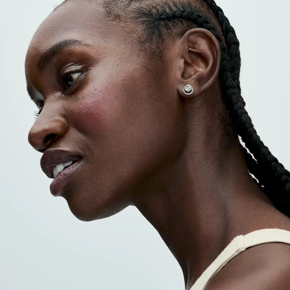 Bring on the shine with our Sparkling Round Halo Stud Earrings. Crafted from sterling silver, these stud earrings feature an off-center round brilliant-cut cubic zirconia surrounded by an eye-catching pavé halo. With 30 sparkling cubic zirconia, these earrings capture the everlasting symbolism of circles. The design, inspired by Pandora Timeless motifs, seamlessly blends classic beauty with giftable elegance. Elevate your style with this pair, perfect for any occasion.