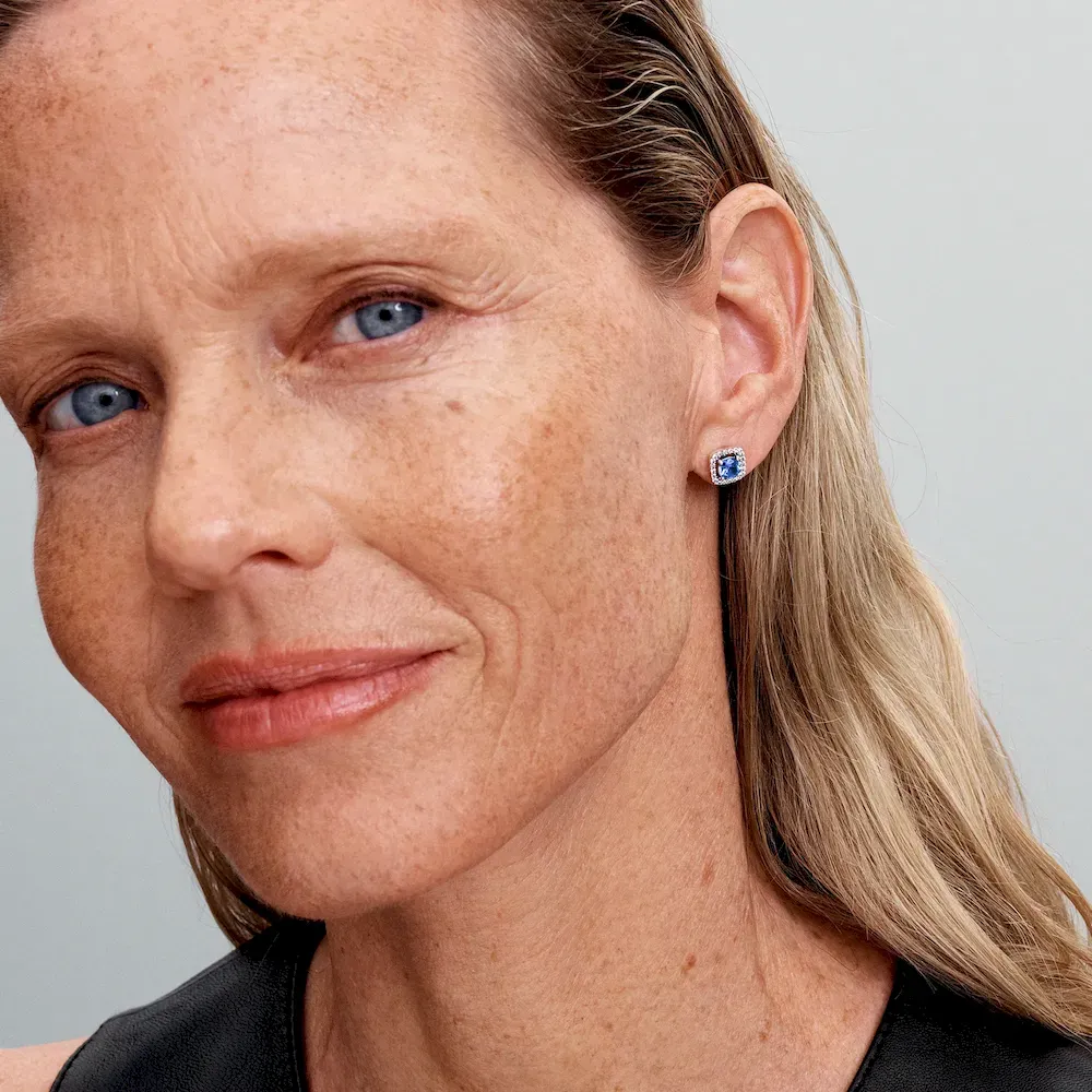 Add a touch of deep blue to your look with our Sparkling Square Blue Halo Stud Earrings. Crafted in sterling silver, these studs add an elegant pop of colour with a modern twist. Featuring a centred squared stone surrounded by a pavé halo, they’re a classic addition to any wardrobe. Great for wearing as a part of a curated ear stack or solo, these elegant studs will quickly become a staple in your rotation.