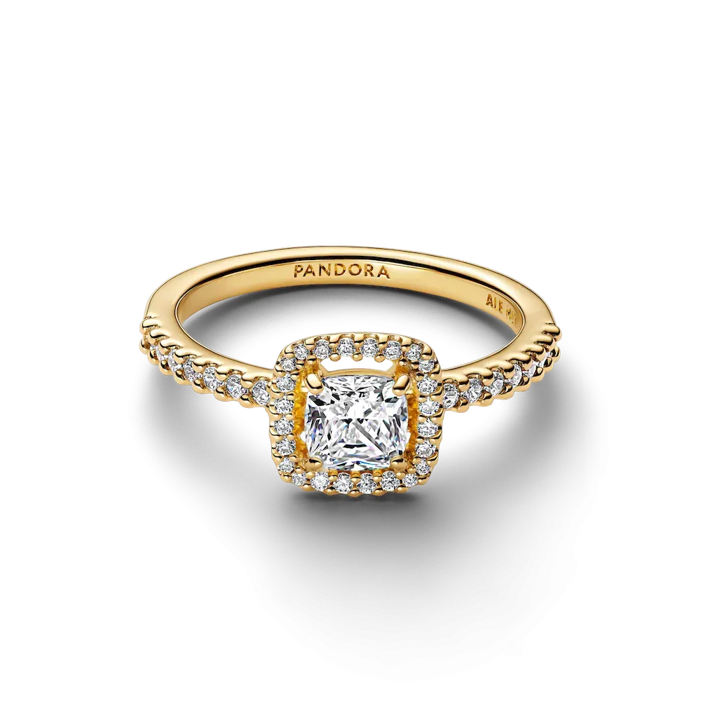 Add sparkle to your stack with this 14k gold-plated ring from Pandora Timeless, featuring square-cut clear cubic zirconia, a pavé halo and band. A modern twist on tradition, made to make you shine brighter in your everyday.