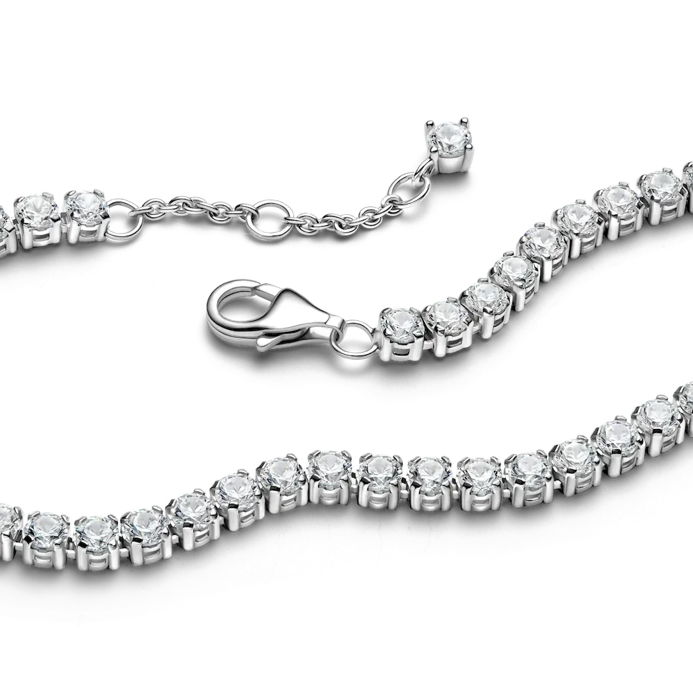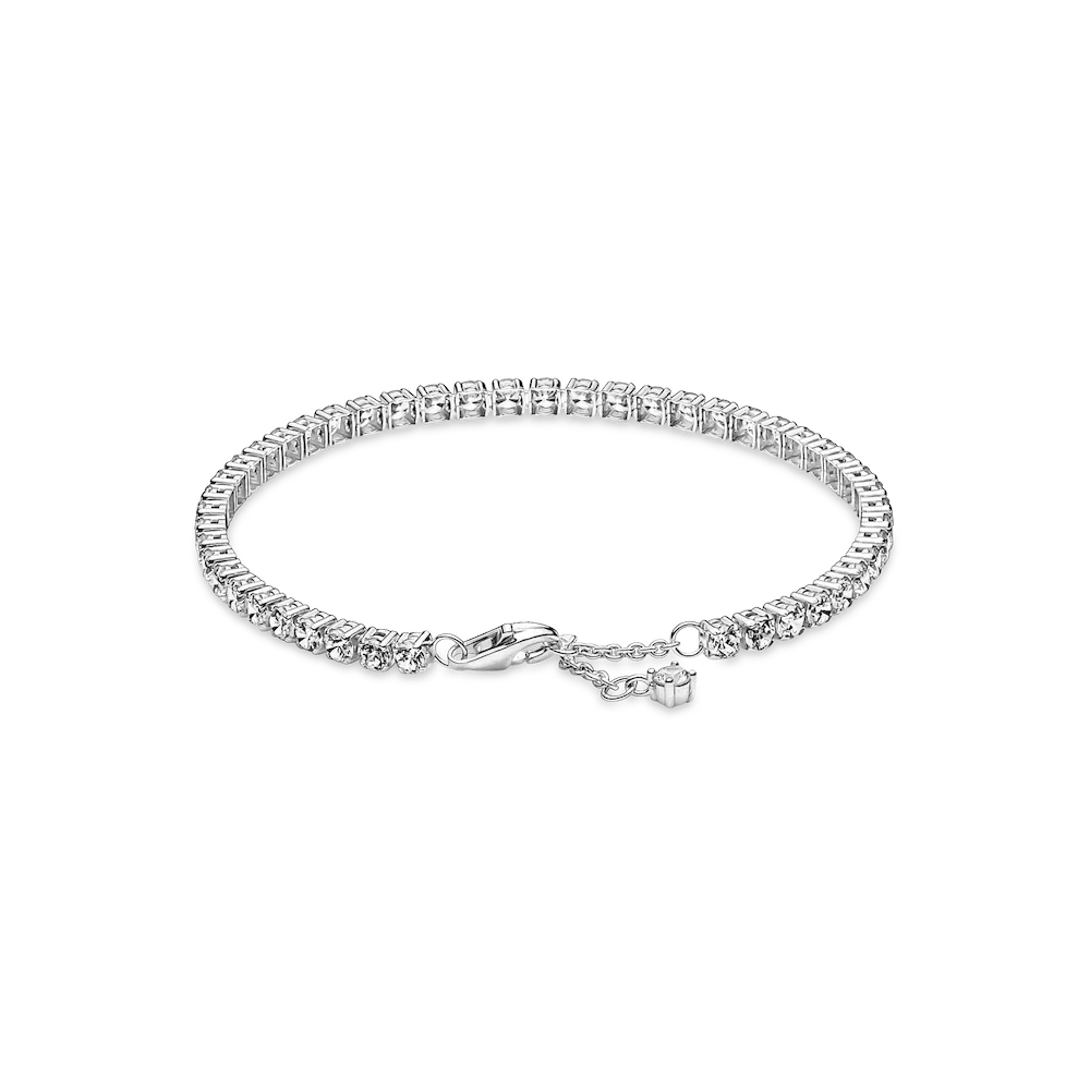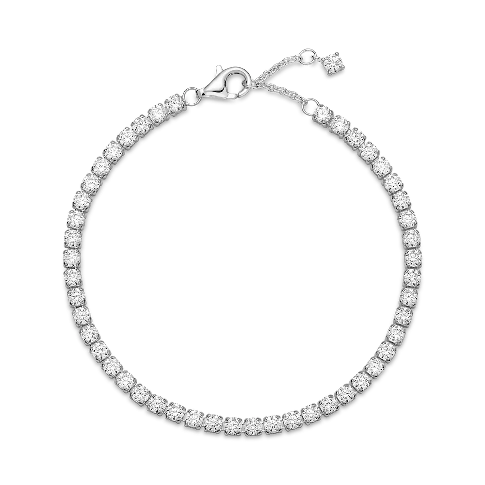 Tennis bracelets, anyone? This sterling silver Sparkling Tennis Bracelet features squared collets and is decorated with a bold line of clear cubic zirconia to make a statement fit for any occasion. Wear it on its own or stack bracelets of different colors and metal finishes for a modern look.
