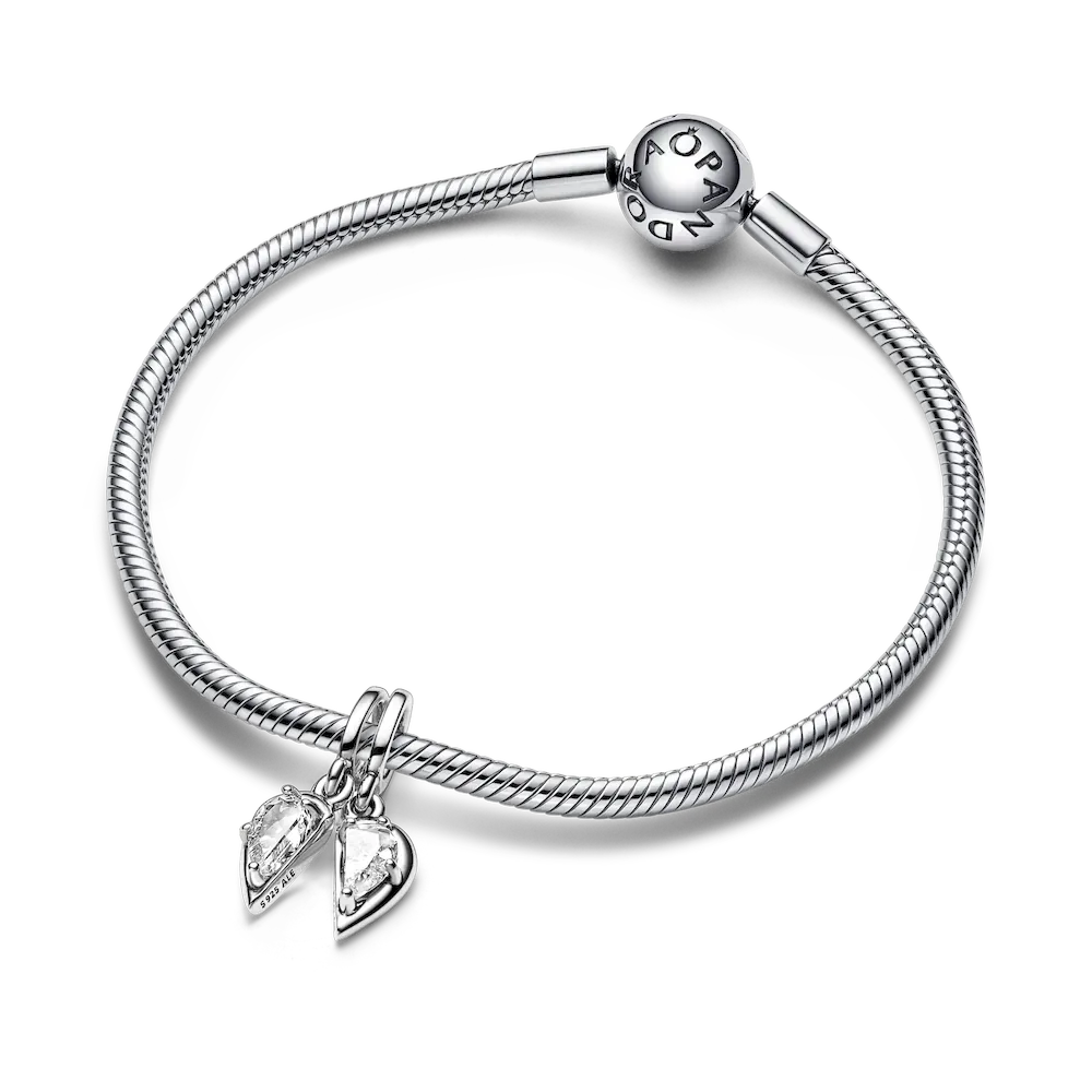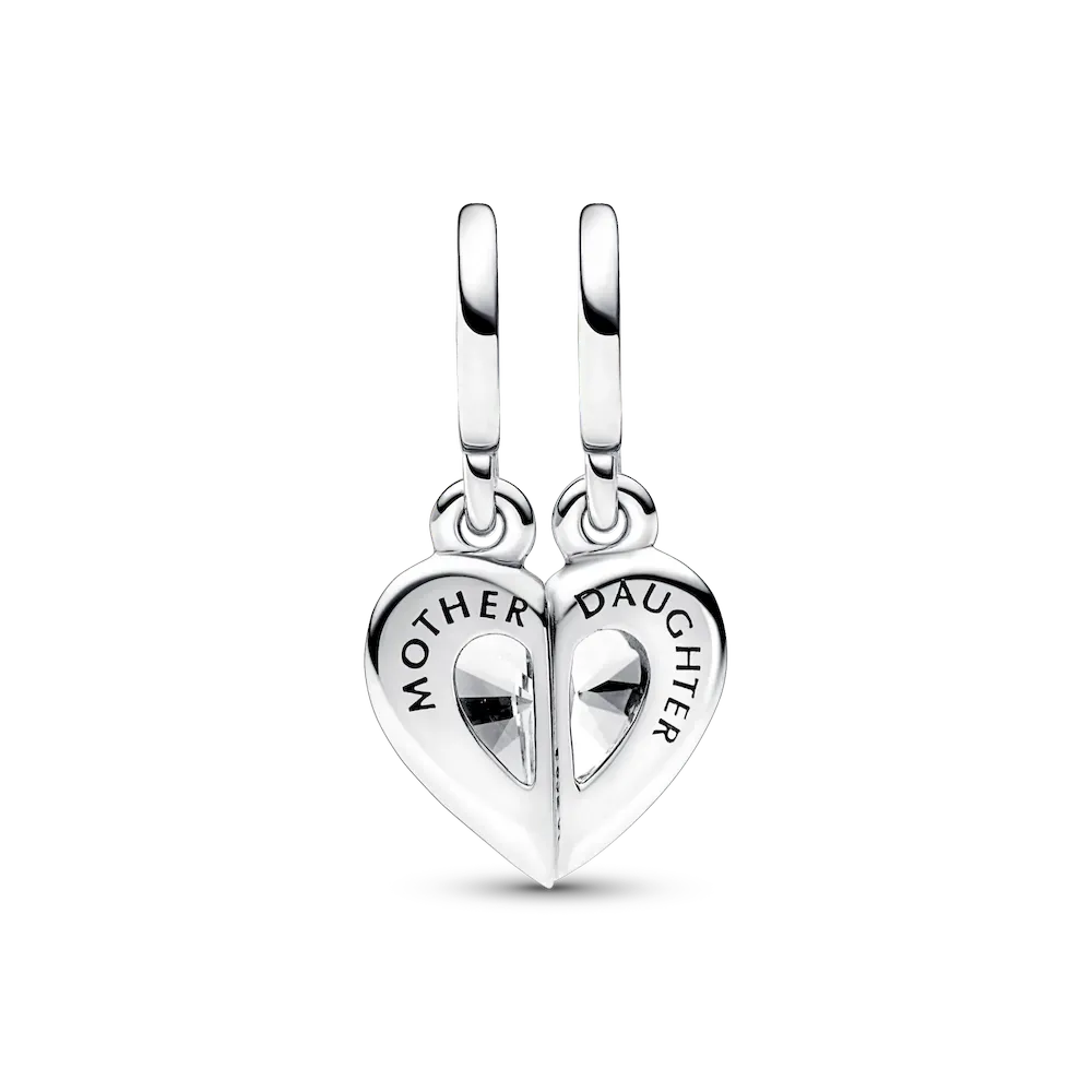 A meaningful charm to symbolize the unbreakable bond between mother and daughter. The Splittable Mother & Daughter Dangle Charm consists of two sterling silver dangle charms that fit together to create a heart shape in two halves, with a clear cubic zirconia stone at the center and a cut-out heart on the reverse side. One half of the charm is engraved with the word