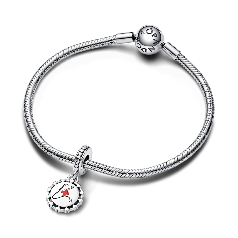 The Stethoscope Engravable Dangle Charm is a tribute to the meaningful and life-saving work of doctors, nurses and medical staff around the world. Crafted from sterling silver, this disc-shaped charm features a stethoscope and red cross motif on one side with enamel details. The other side is blank for your own engraving, and a pattern of hearts adds detail around the edges and bail. A meaningful gift for a loved one in the medical professions.
