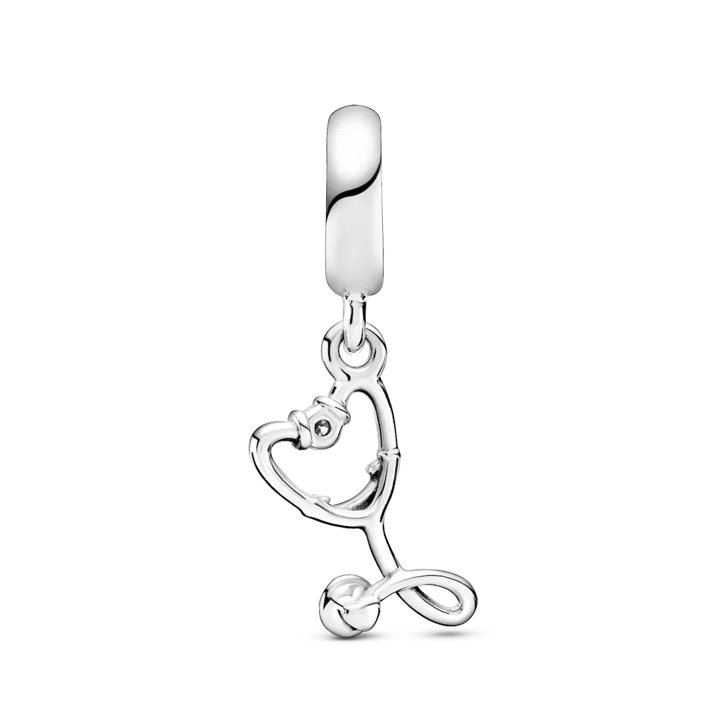 Celebrate hardworking medical professionals with the Stethoscope Heart Dangle Charm. A stethoscope twisted into a heart shape, this piece is hand-finished in sterling silver. One bezel-set cubic zirconia appears at the top of the charm, while small beads feature around the edge of the hollowed-out chest piece for added detailing. Ideal for someone who has a lot of heart, this piece would make a great addition to any Pandora Moments bracelet.